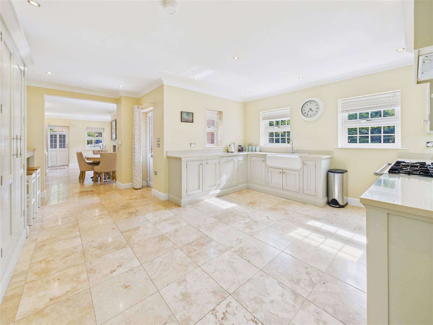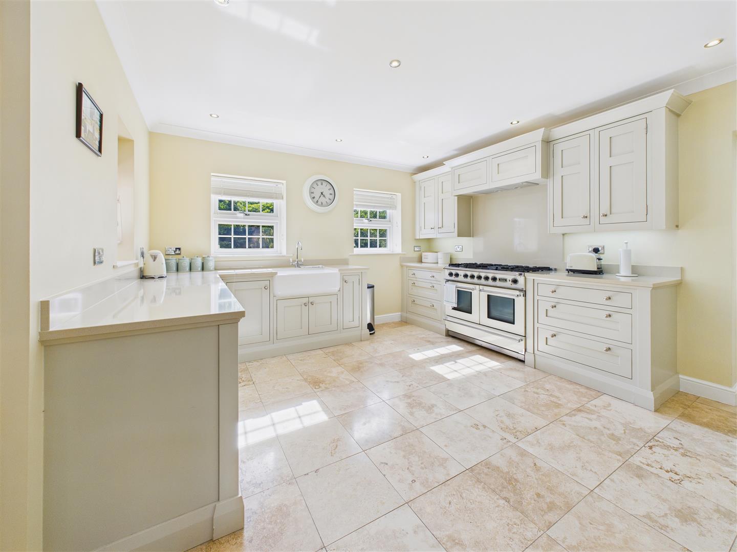 Kitchen - Having a stunning range of bespoke, fitted units installed by Aquarius of Howden, comprising an extensive range of units with Silestone work surfaces and an oak breakfast bar area. There is a large Belfast sink, integrated dishwasher, fridge freezer and a Falcon Range cooker. Travertine flooring extends throughout and there are recessed down lighters to the ceiling. Windows look out to two elevations and there is an external entrance door leading out to the side driveway and garage.