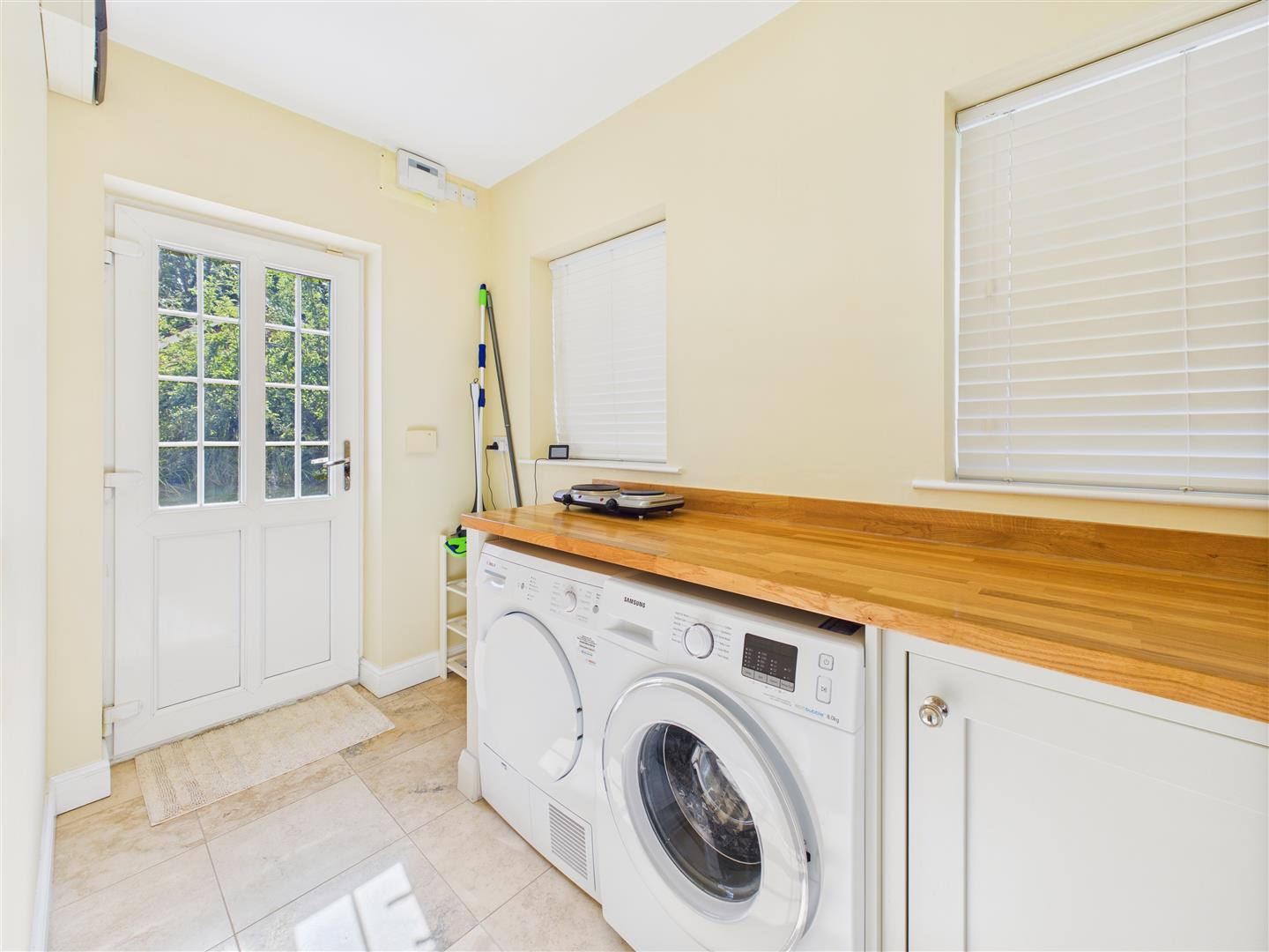 Utility - Having a range of fitted units with oak work surfaces, plumbing for an automatic washing machine, wall mounted gas fired central heating boiler, cupboard to corner, windows to rear and external access door as well as space for further appliances.