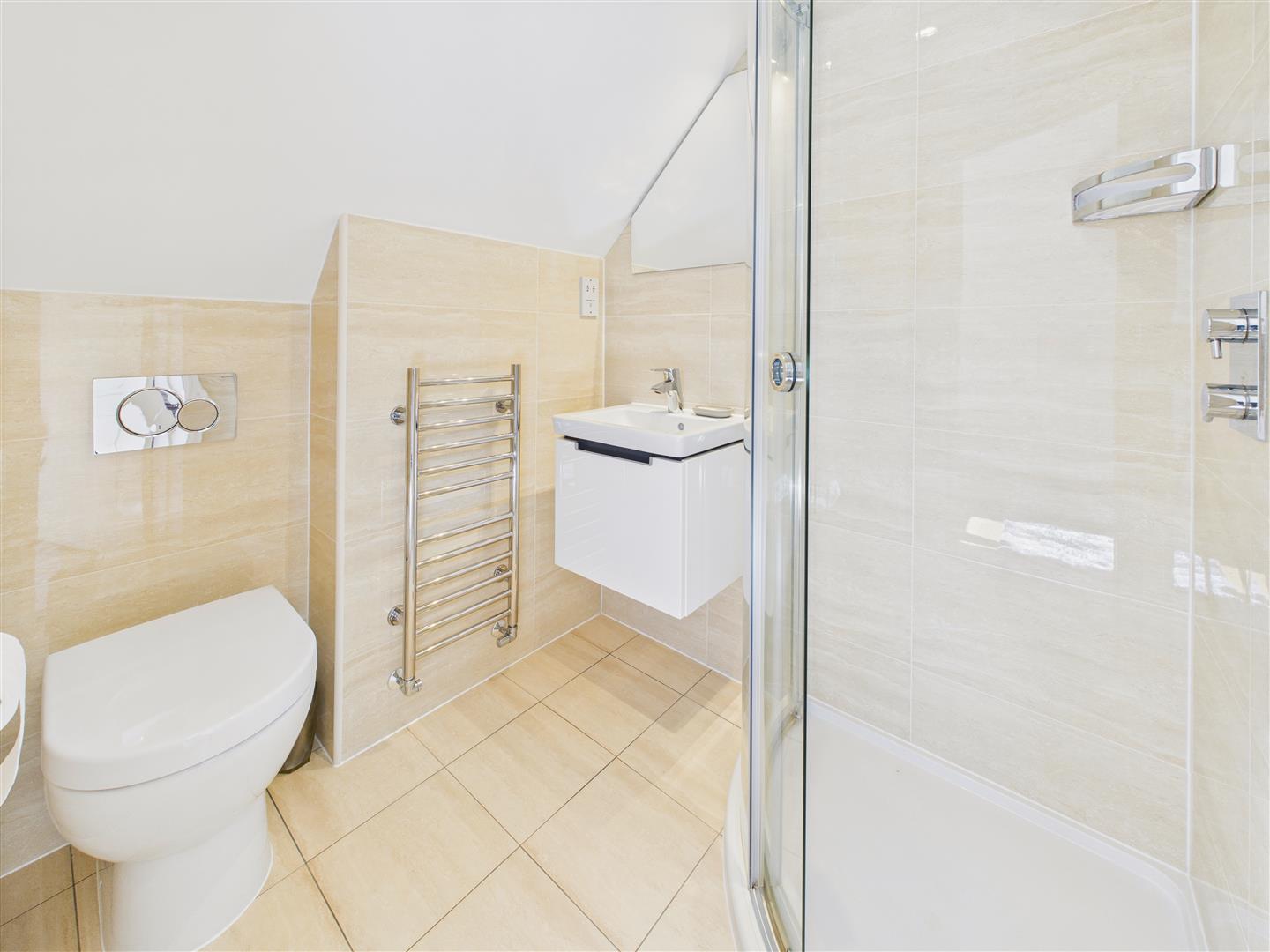 En-Suite Shower Room - Incorporating a Villeroy and Boch low-flush W.C., wash-hand basin, shower enclosure, heated towel rail and tiled surround and flooring.