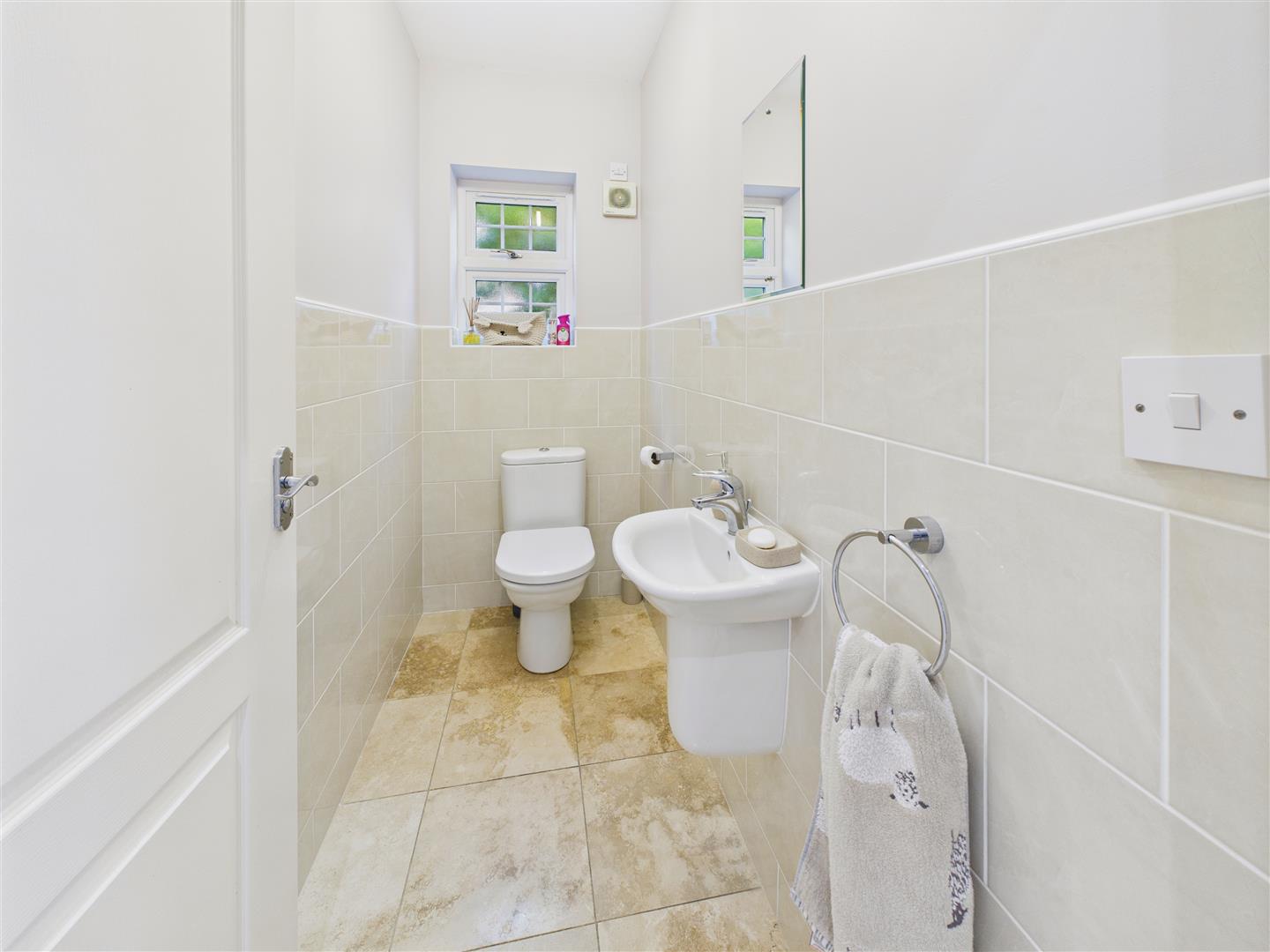Cloaks/W.C. - With low-flush W.C. beneath window to side elevation, wash hand basin, travertine floor and tiled surround.