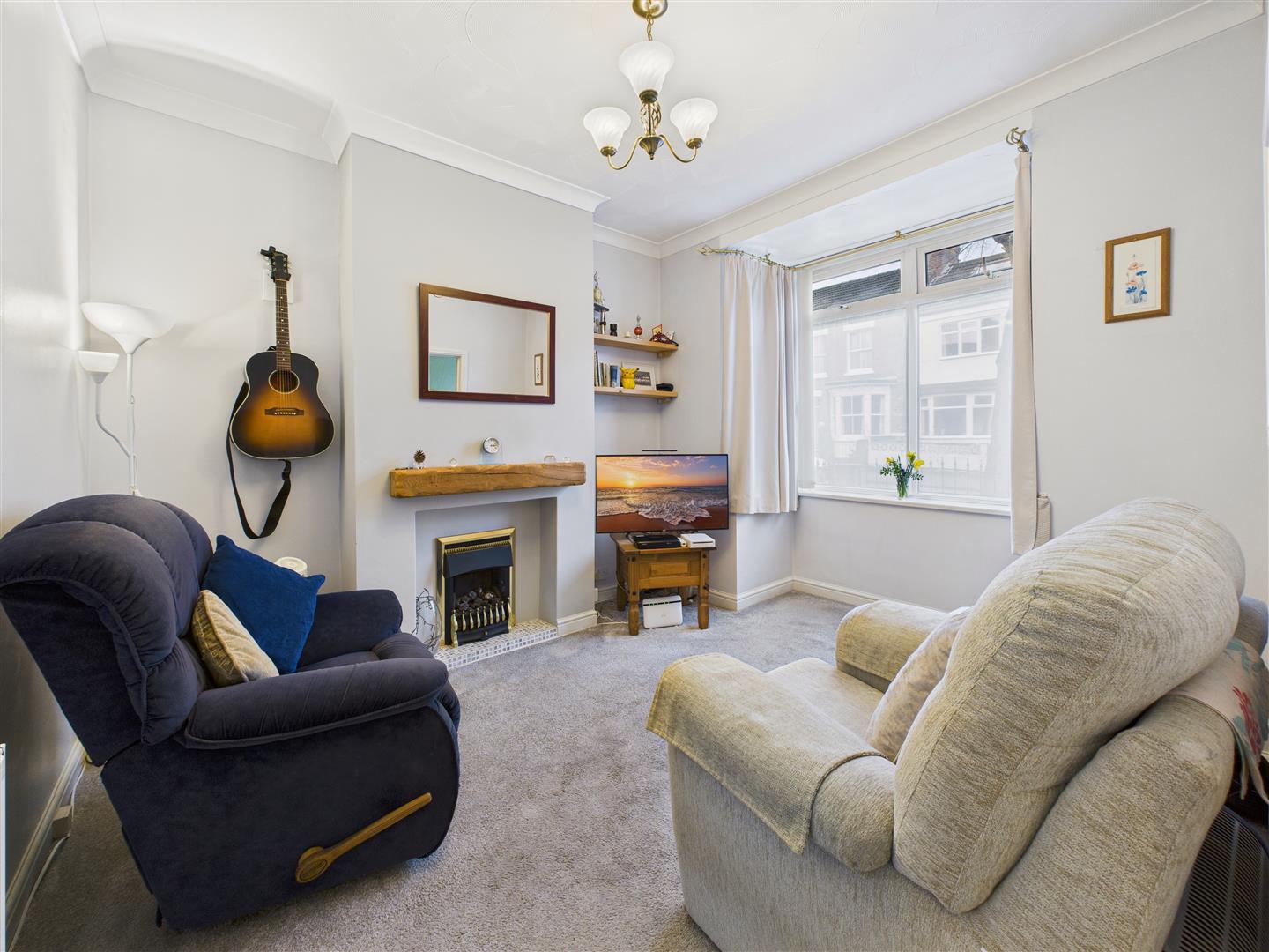 Sitting Room - With feature fire surround housing a living flame gas fire. Useful understairs storage and window to rear.