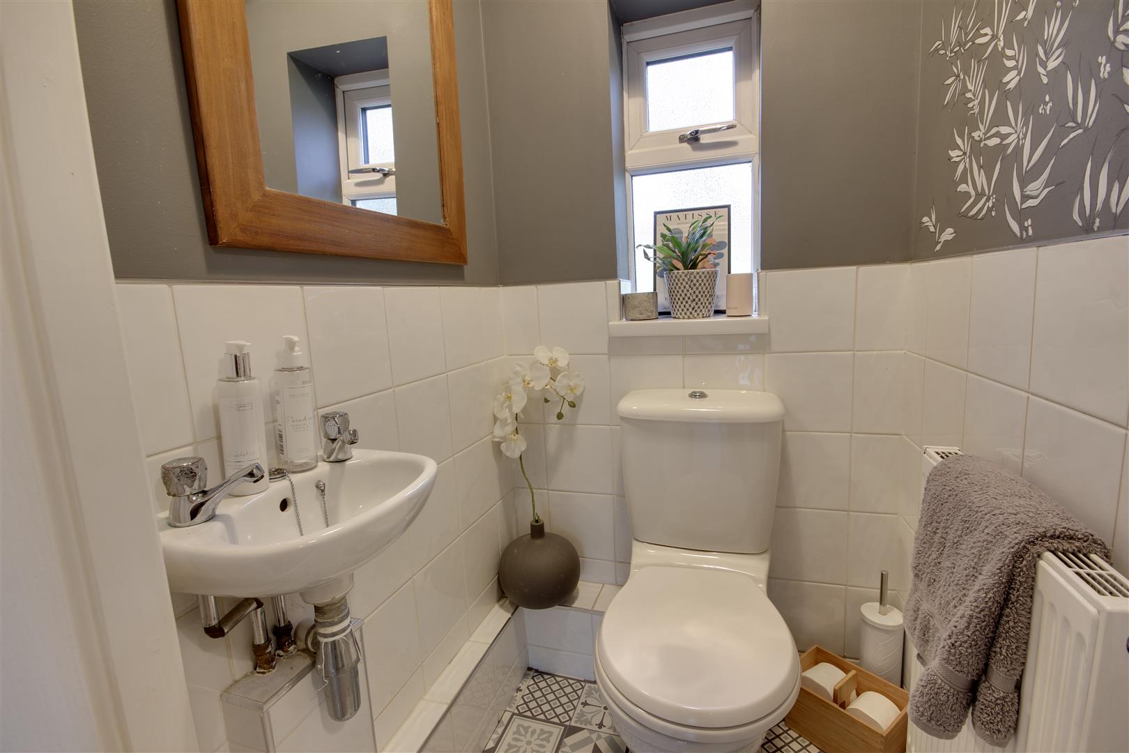 Guest Cloakroom - With window to side and low-flush W.C. and wash-hand basin. Detailed, hand painted wall art and patterned tiling provide an aspect of comforting luxury.