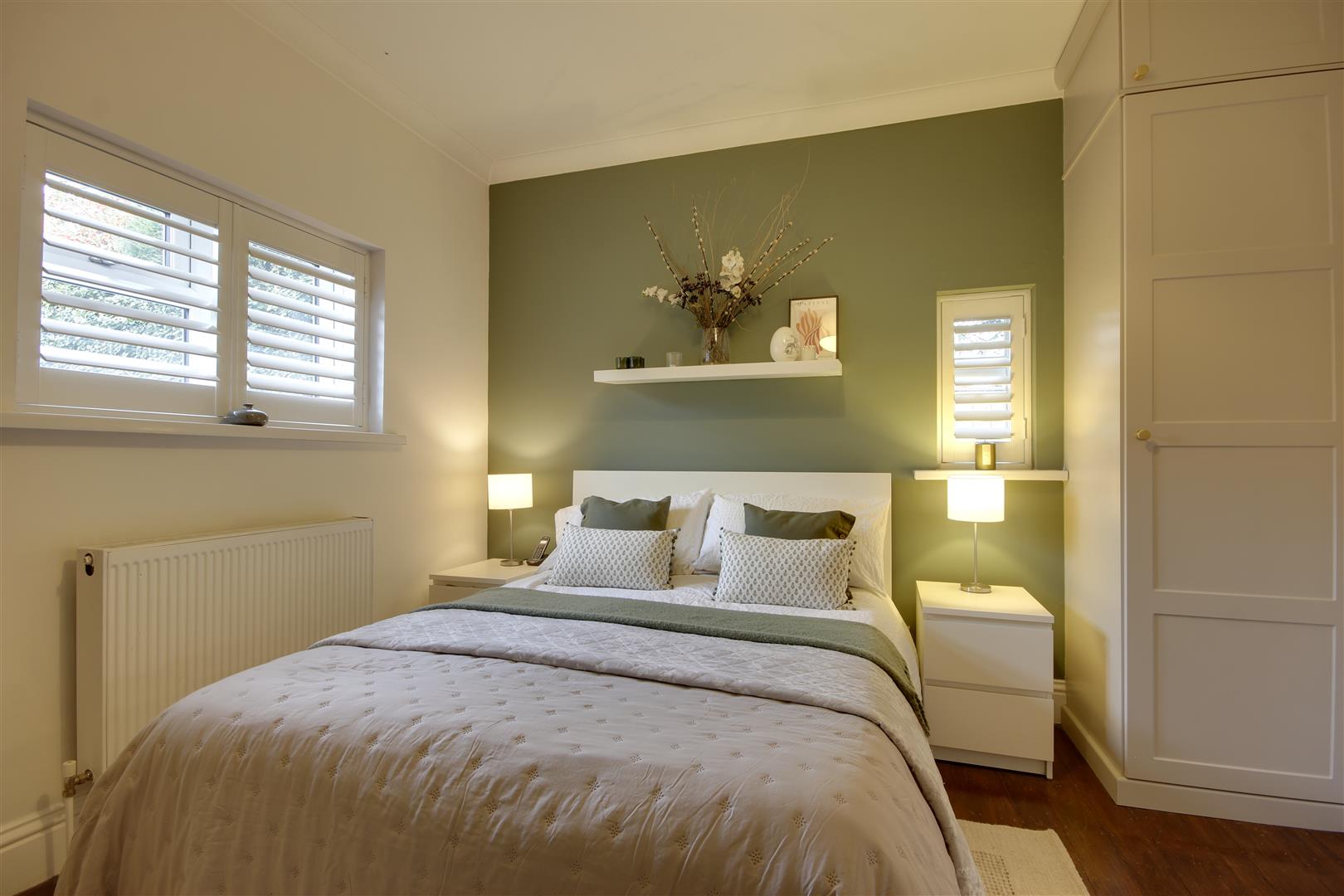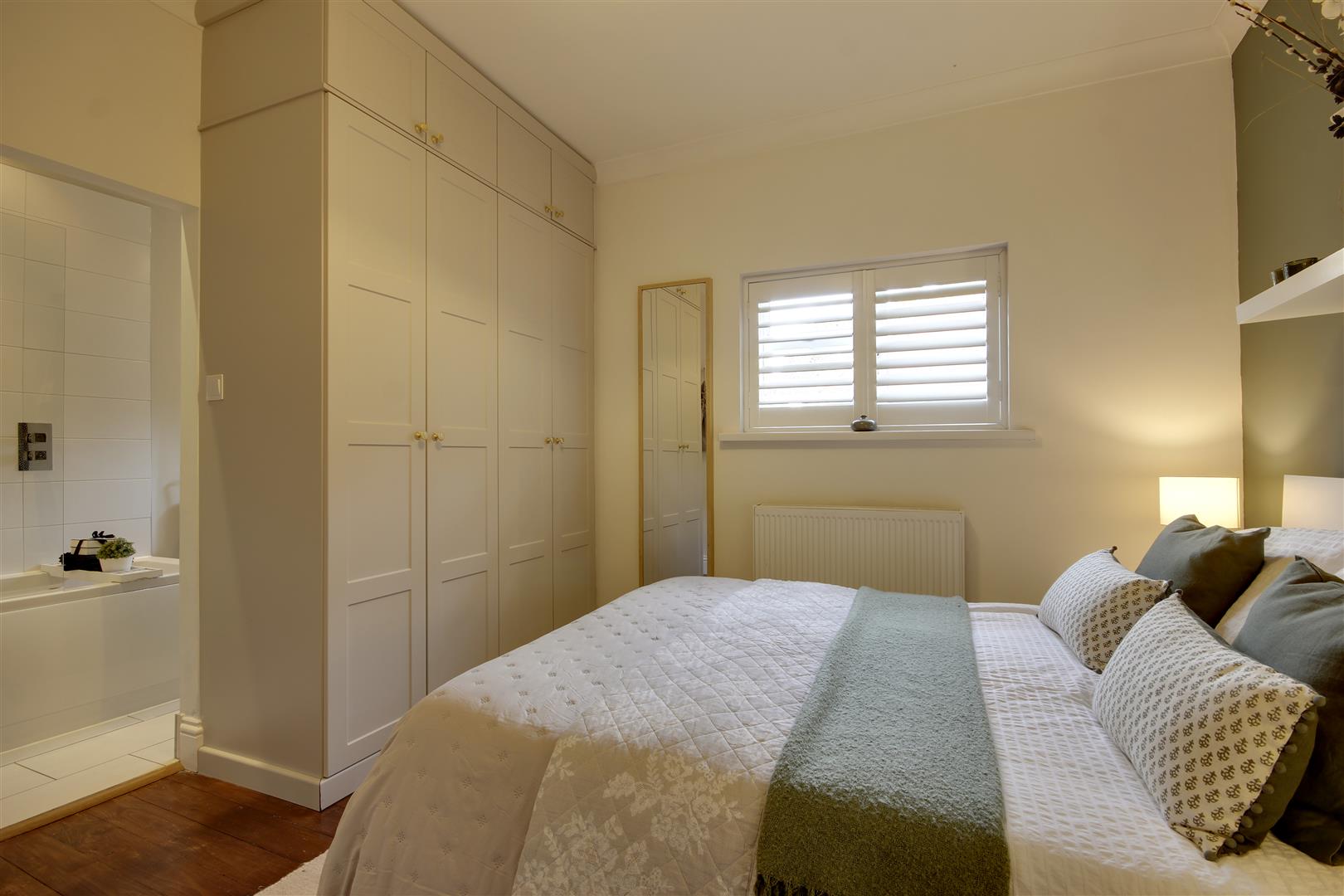 Bedroom - 3.38m x 3.35m approx (11'1" x 11'0" approx) - The bedroom, with stripped-back wood flooring has a cosy feel with an archway opening into the en-suite bathroom. There are fitted wardrobes panelled wainscot style doors and two windows to side and rear with shutters.