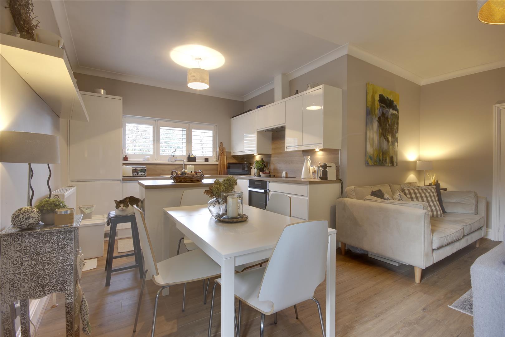 Kitchen Area - The kitchen space houses an Island unit with cupboards underneath. The contemporary fitted units include an array of integrated appliances including a dishwasher and fridge-freezer. Atop the immaculately presented units sits a 4-ring induction hob with fan above, and under-cupboard lighting further enhances the warmth of the area. A sink & drainer lies beneath the window to rear, with fitted shutters.