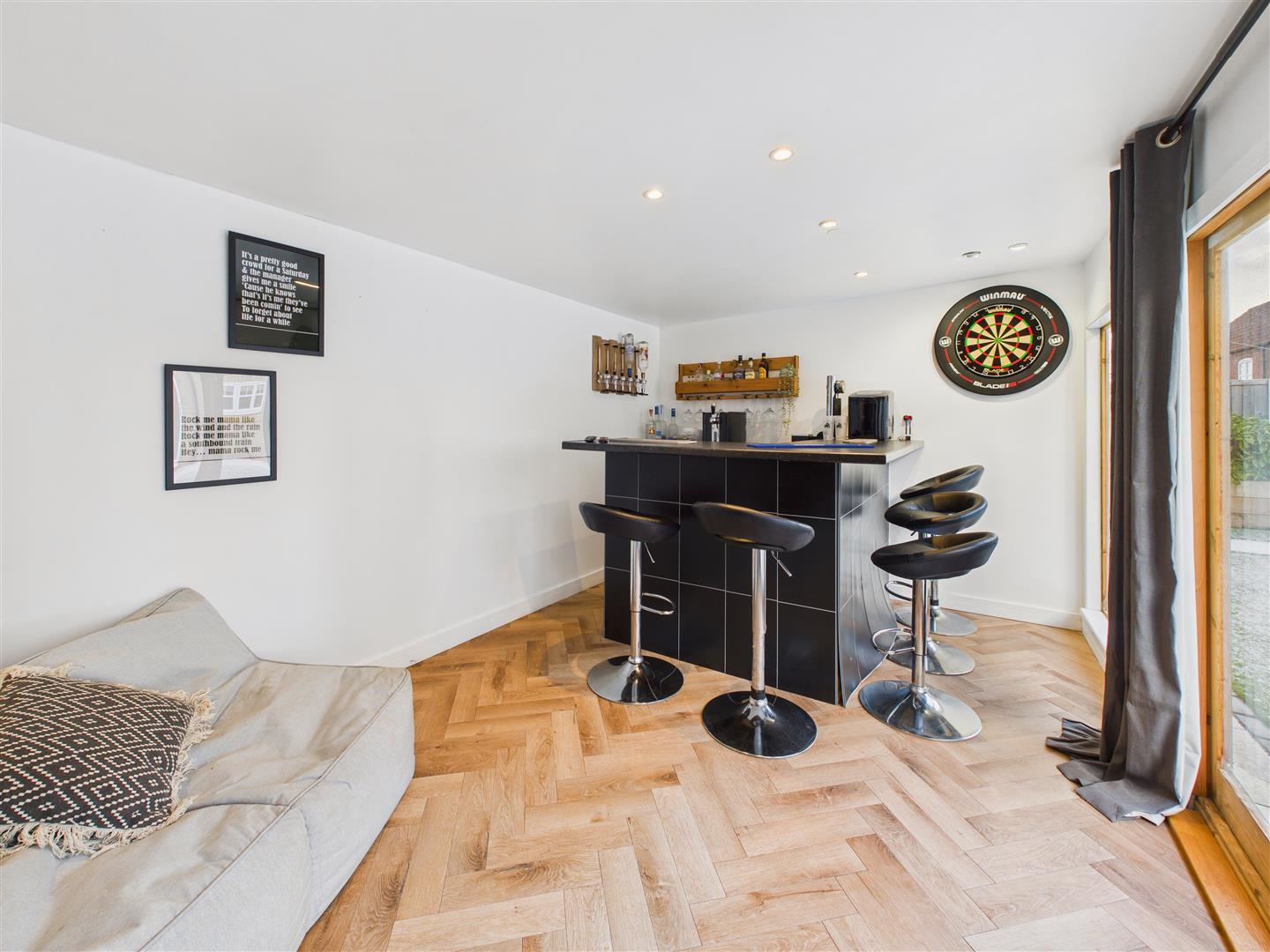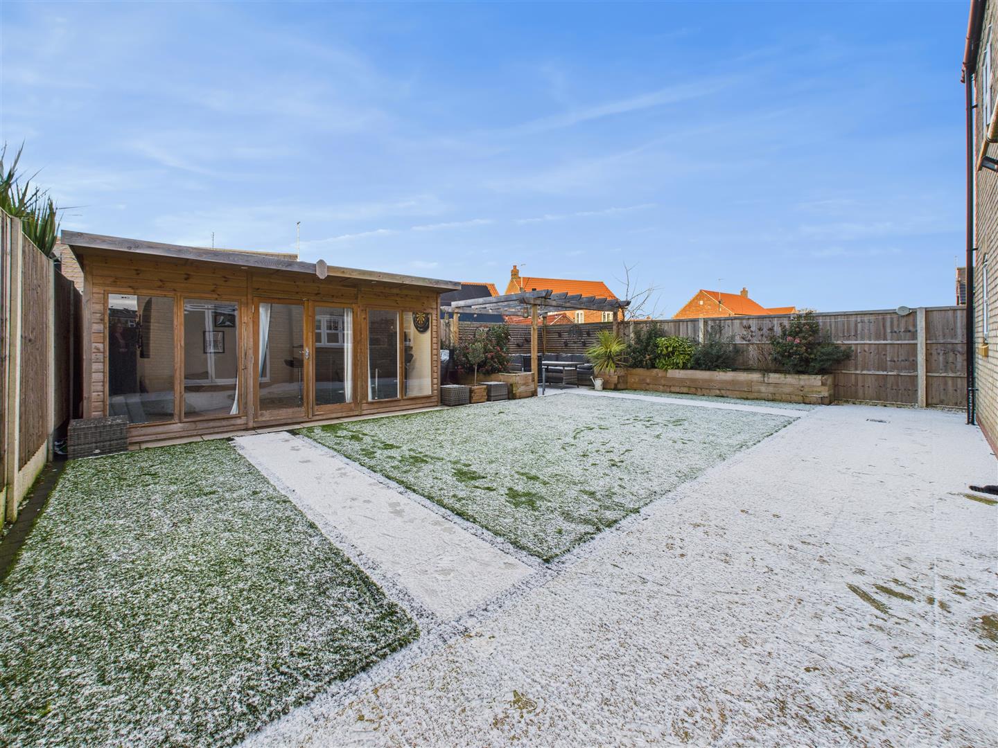 Outside - The property is positioned at the head of a no-through road and enjoys extensive parking for several vehicles to the front with an attractive lawned area. The rear garden enjoys much privacy and has been transformed into a private oasis designed for low-maintenance enjoyment, featuring an artificial lawn, raised planters, and a pergola-shaded patio. A standout feature is the substantial timber cabin-complete with a built-in bar, power, and lighting-offering a versatile outdoor entertaining space.