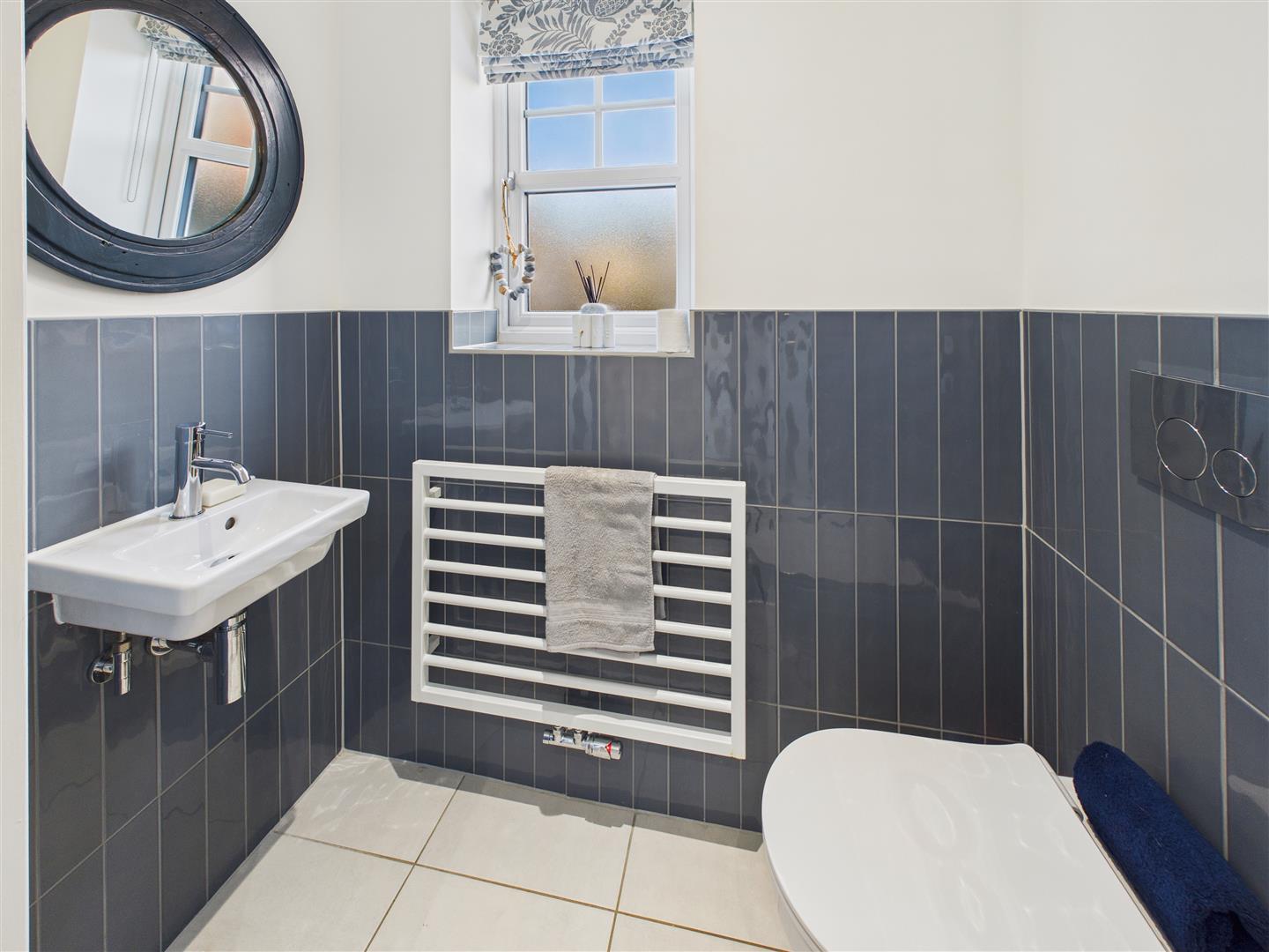 Bathroom - With suite comprising a bath with shower over and screen, wash hand basin and low flush W.C. Heated towel rail, part tiling to walls, tiled floor and window to rear.