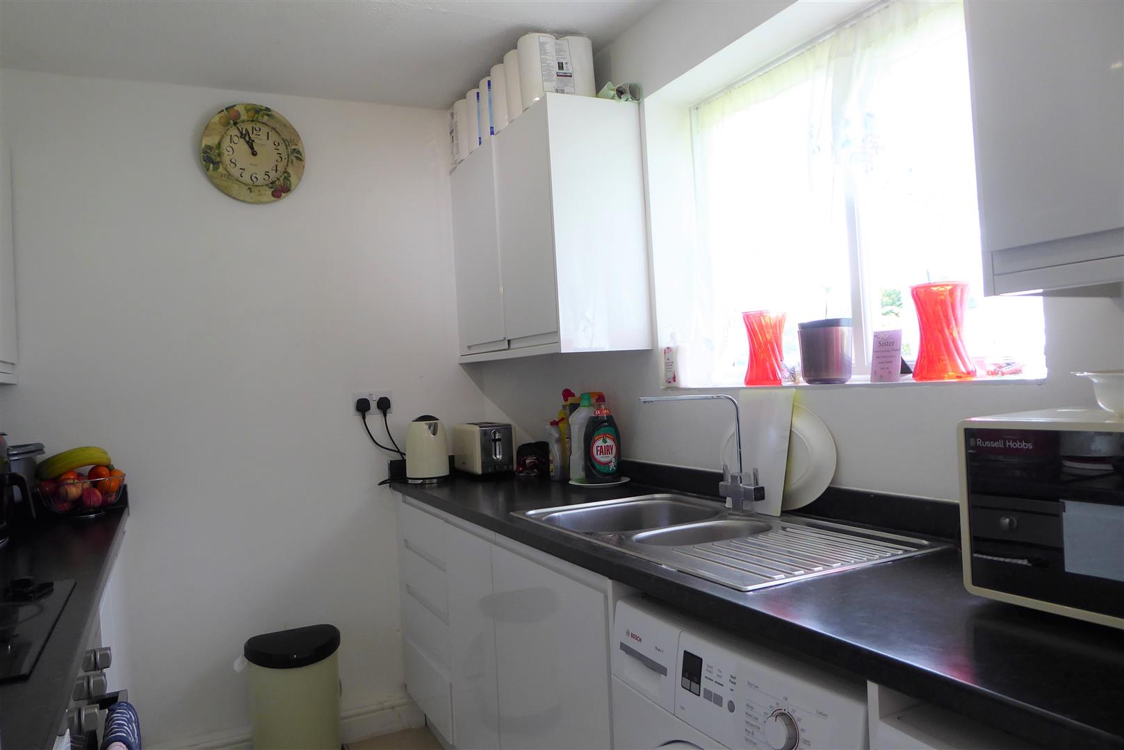 Kitchen - Modern fitted kitchen with a range of wall and base units, 1 1/2 bowl sink with mixer tap, four ring electric hob with oven below and extractor above, space for fridge/freezer, dishwasher and washing machine, tiled flooring, front aspect double glazed window.
