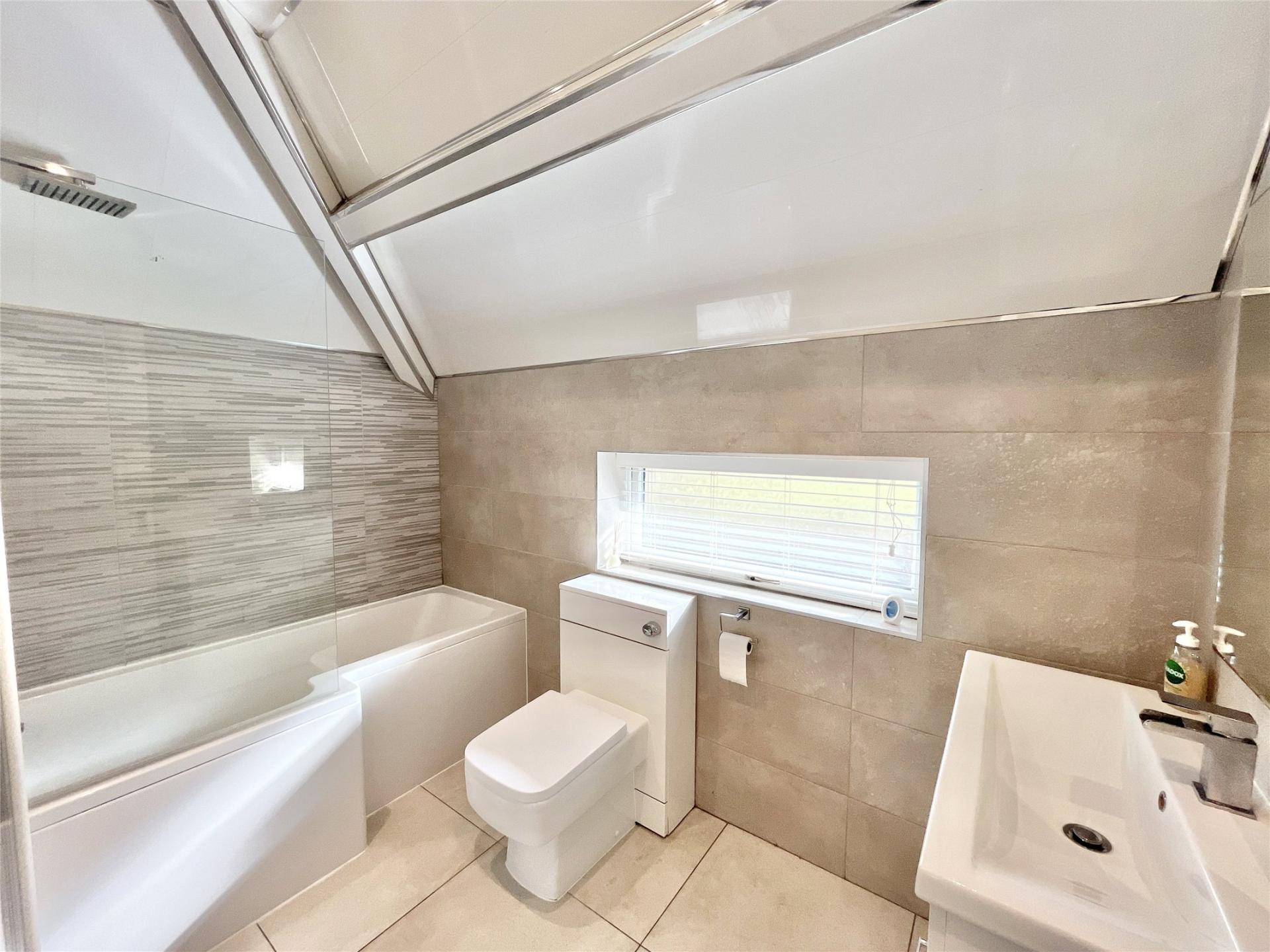 Bathroom An impressive family bathroom equipped with a panelled bath with a rainfall shower over and shower screen, low level wc with a concealed cistern and a hand wash basin set to a vanity storage unit. The bathroom has tiling to the walls and floor and a double glazed window.