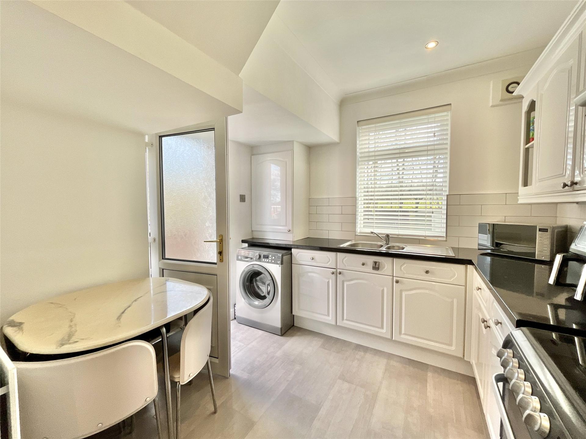 Dining Kitchen Fitted with a range of modern wall and base units with work surfaces over, tiled splash back surrounds and incorporates a stainless steel sink unit with drainer. Space is provided for the inclusion of a free standing cooker with extractor positioned over, a free standing larger style fridge, under counter washing machine and tumble dryer. The room has recessed lighting, coving to the ceiling, a double glazed window to the rear elevation and a central heating radiator. A double glazed door provides access to the garden.