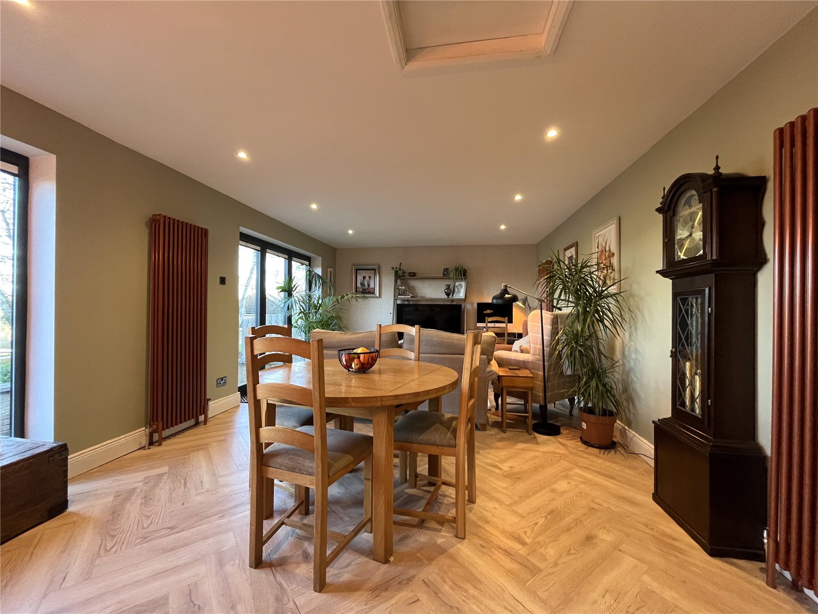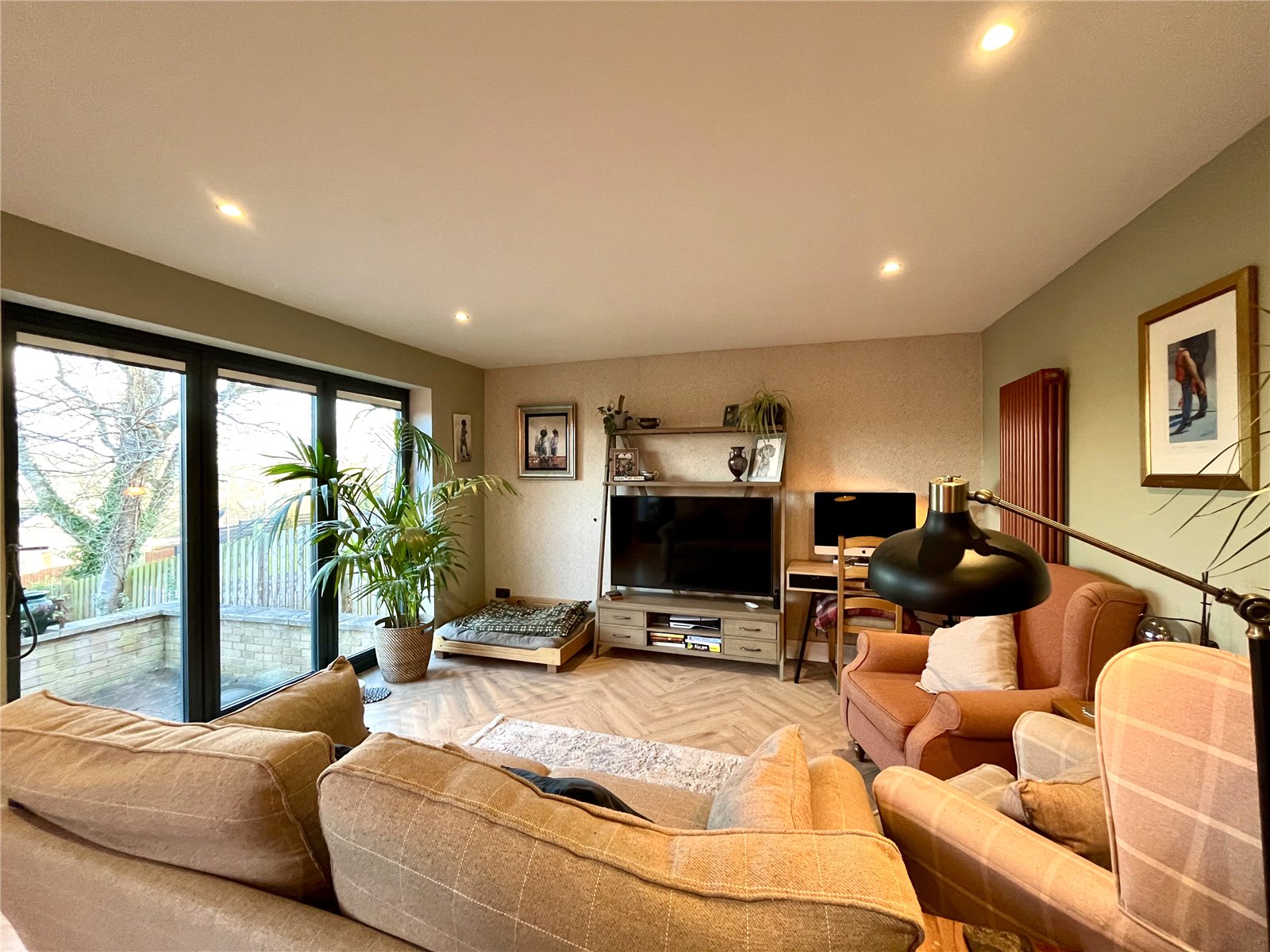 A most generous sized room running the entire length of the property, all open plan and comprising; fitted wall and floor cabinets with handleless doors, Quartz worktops over incorporating a one and a half bowl sink unit with mixer tap over. Five ring induction hob with extractor canopy over, built-in double ovens. Integrated dishwasher, pantry unit and concealed bins. Matching breakfast bar. Spacious Dining Area which in turn is the Living Room with bi-folding doors out onto a raised patio. All windows have a pleasant garden outlook and beyond.