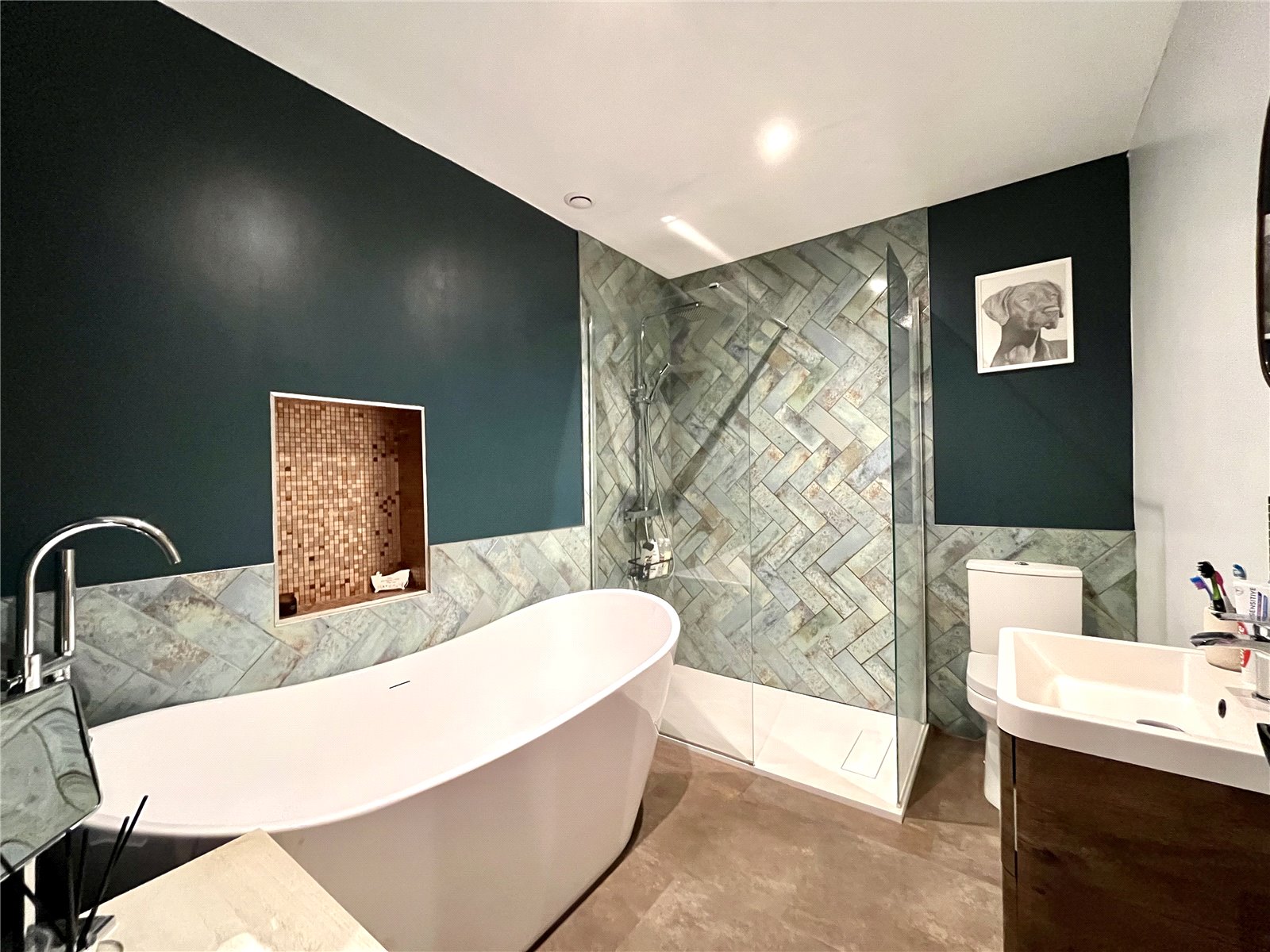 Freestanding 'egg' bath, large double sized separate shower cubicle, wash hand basin with drawers under, low level WC, attractive tiled splash backs and large chrome heated towel rail.