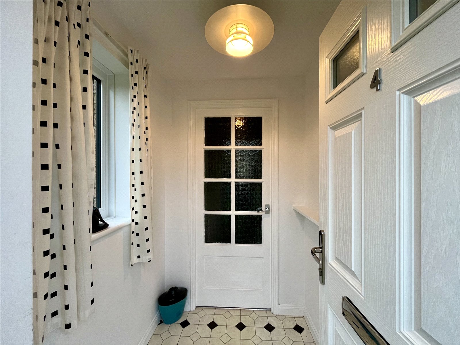 Fitted wall and floor cabinets in high gloss finish, with worktops over incorporating a stainless steel sink with single drainer and mixer tap over. Four ceramic hob with extractor hood over and double ovens under. Plumbing for dishwasher. uPVC rear door to gardens.