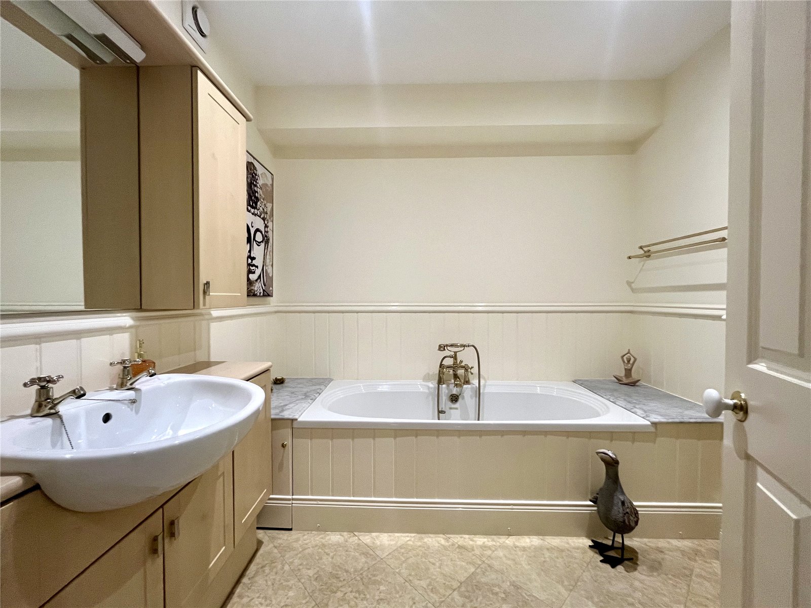 Double ended panelled bath with shower attachment, wash hand basin with cabinets above and below with fitted mirror, low level WC and half panelled walls.
