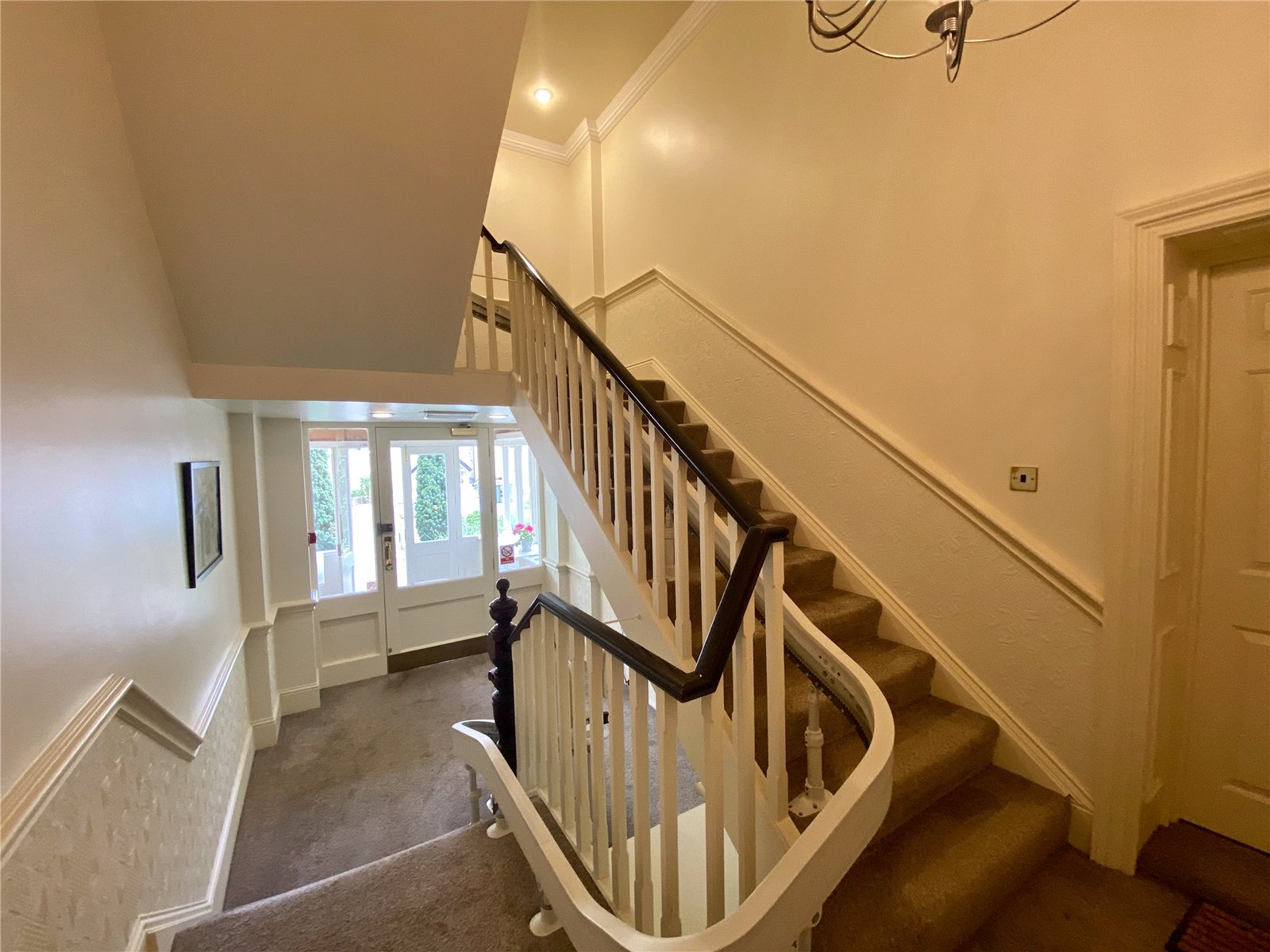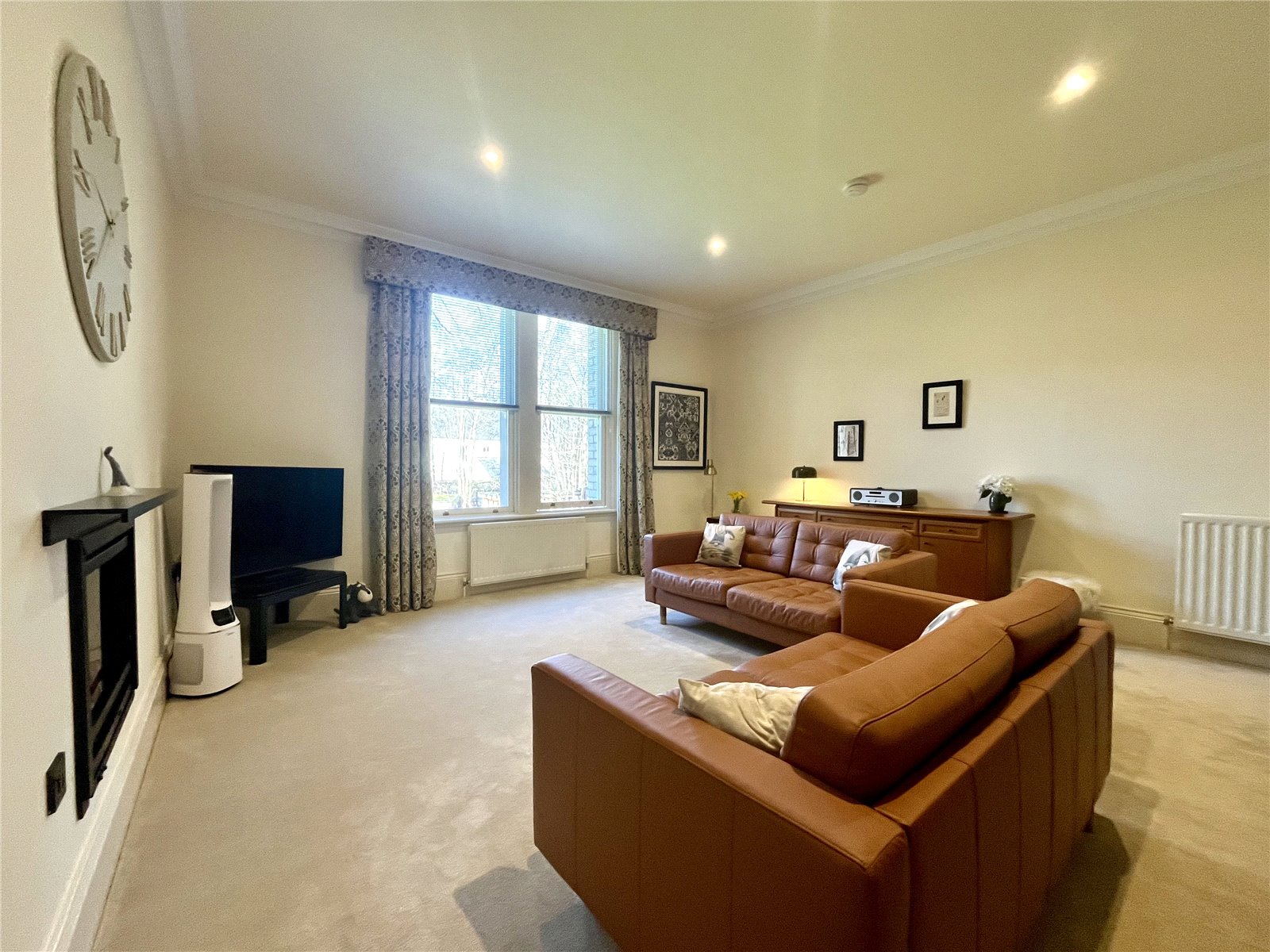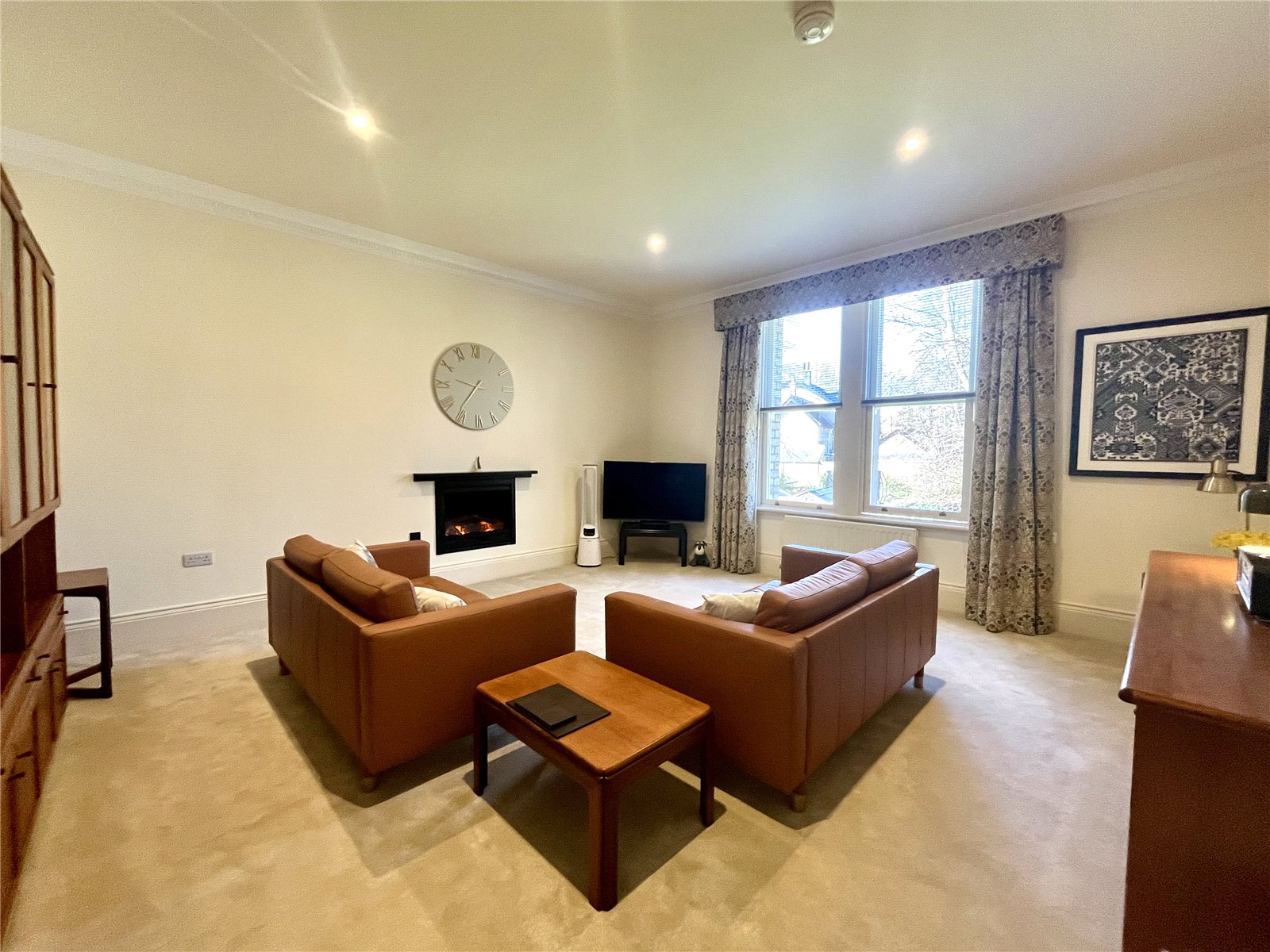 A spacious, light and airy room with large picture windows overlooking the gardens below. Wall inset living flame log-effect fire and ornate cornice ceiling. A very pleasant and sunny room of generous proportions.