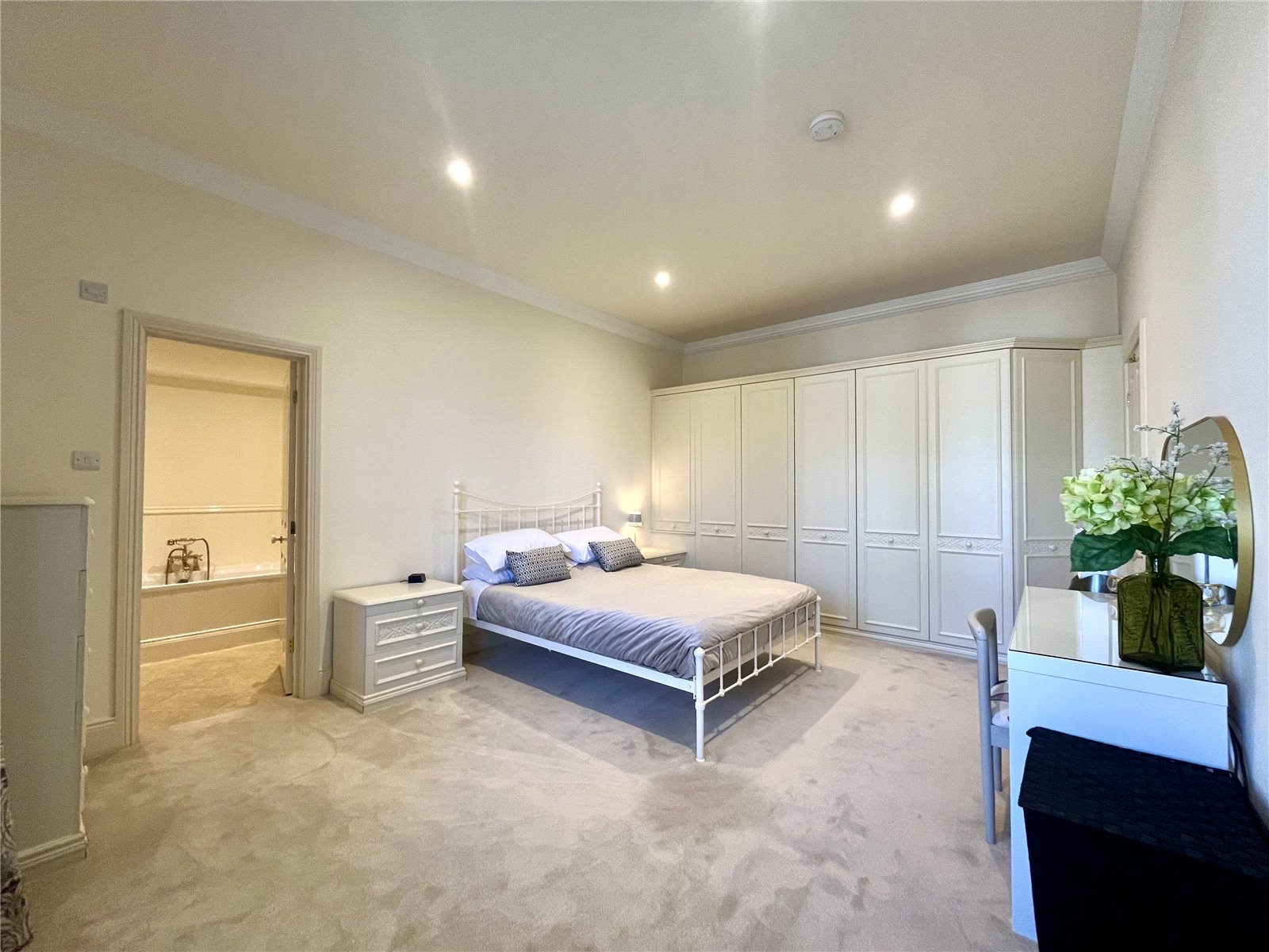 Enjoying similar views over the front lawns, this spacious bedroom has two full height windows, a range of fitted wardrobes with hanging and shelving space, matching drawers and bedside cabinets. Ornate cornice ceiling and additional walk-in storage cupboard/wardrobe with further hanging and shelving space.