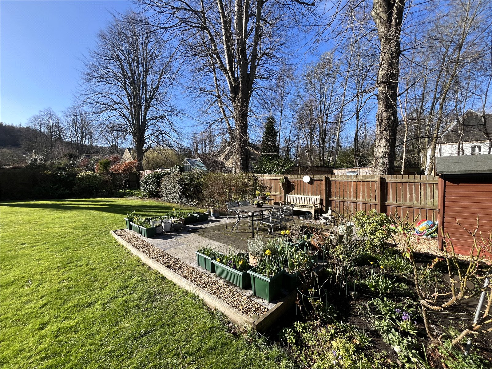 Comprising extensive lawned areas, mature trees, bushes, shrubs and flower beds. Large patio area and bin store.