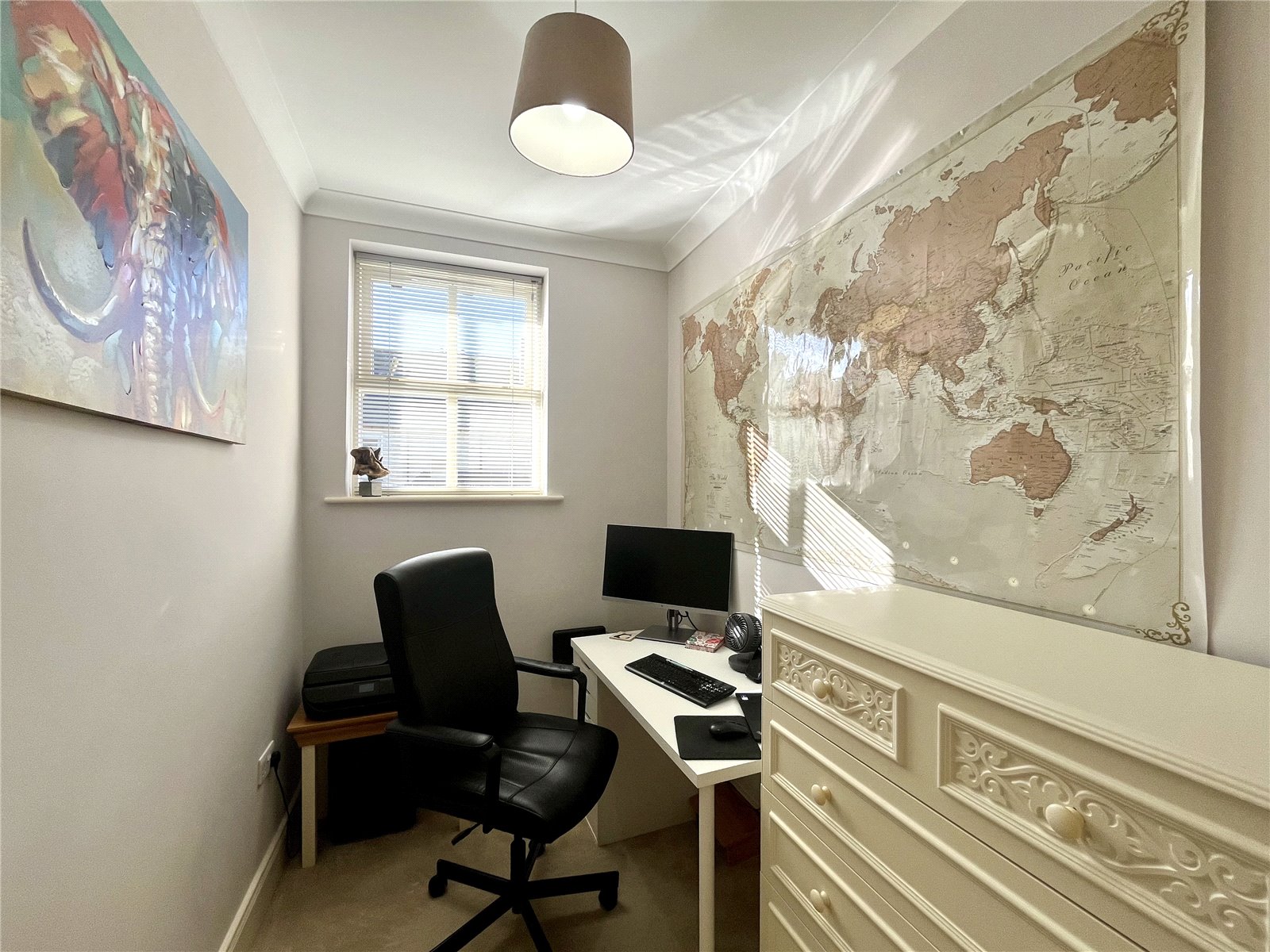 Range of fitted wardrobes with ample hanging and shelving space and a concealed desk and matching drawer. Cornice ceiling.