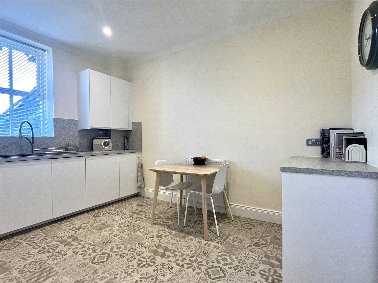 Recently refitted to a high standard with fitted wall and floor cabinets with worktops incorporating a sink with single drainer. Four induction hob with an electric oven under and an extractor above. Splash back and fully integrated dishwasher, fridge and freezer, all with matching fascias. Plumbing for washing machine and space for tumble dryer. Cornice ceiling and cupboard housing the boiler. Cornice ceiling and cupboard housing the boiler, Ample space for a dining table.