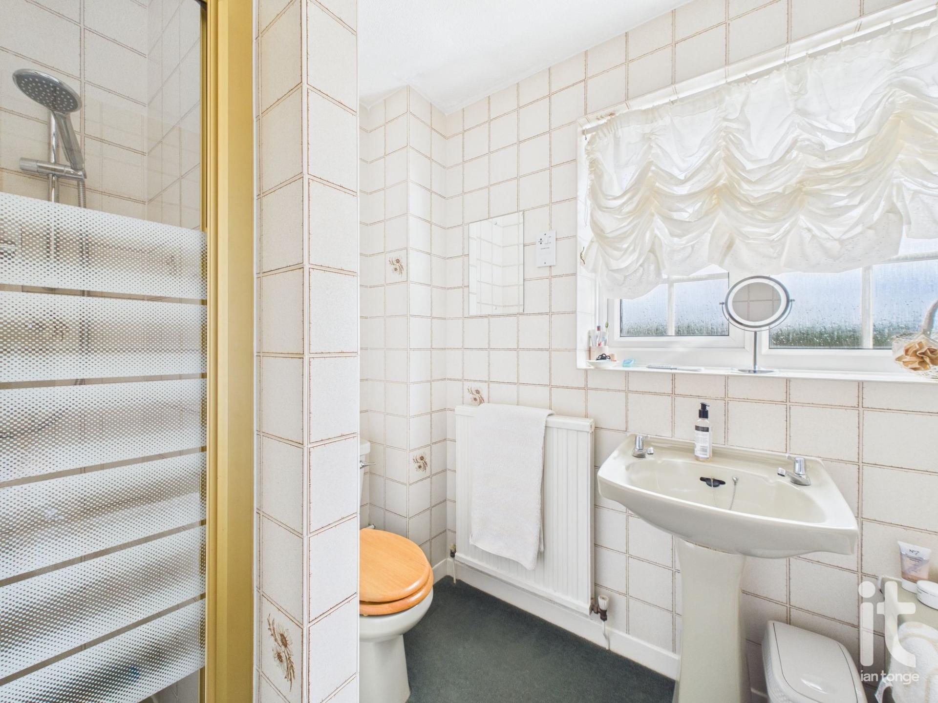 uPVC double glazed window to rear aspect. Suite comprising of:- panelled bath, pedestal handwash basin, low level W.C, shower cubicle. Radiator, corner cabinet, fully tiled walls.
