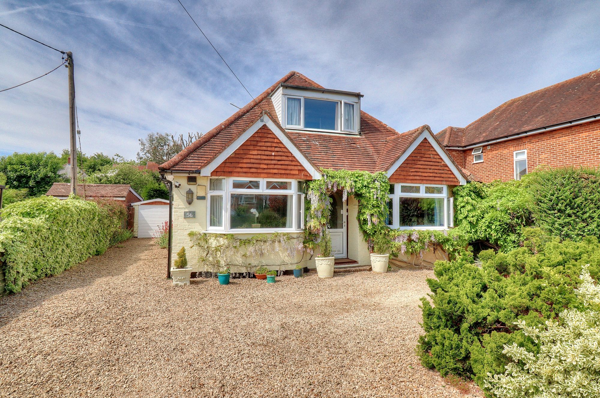 A detached chalet style bungalow with large well kept gardens.