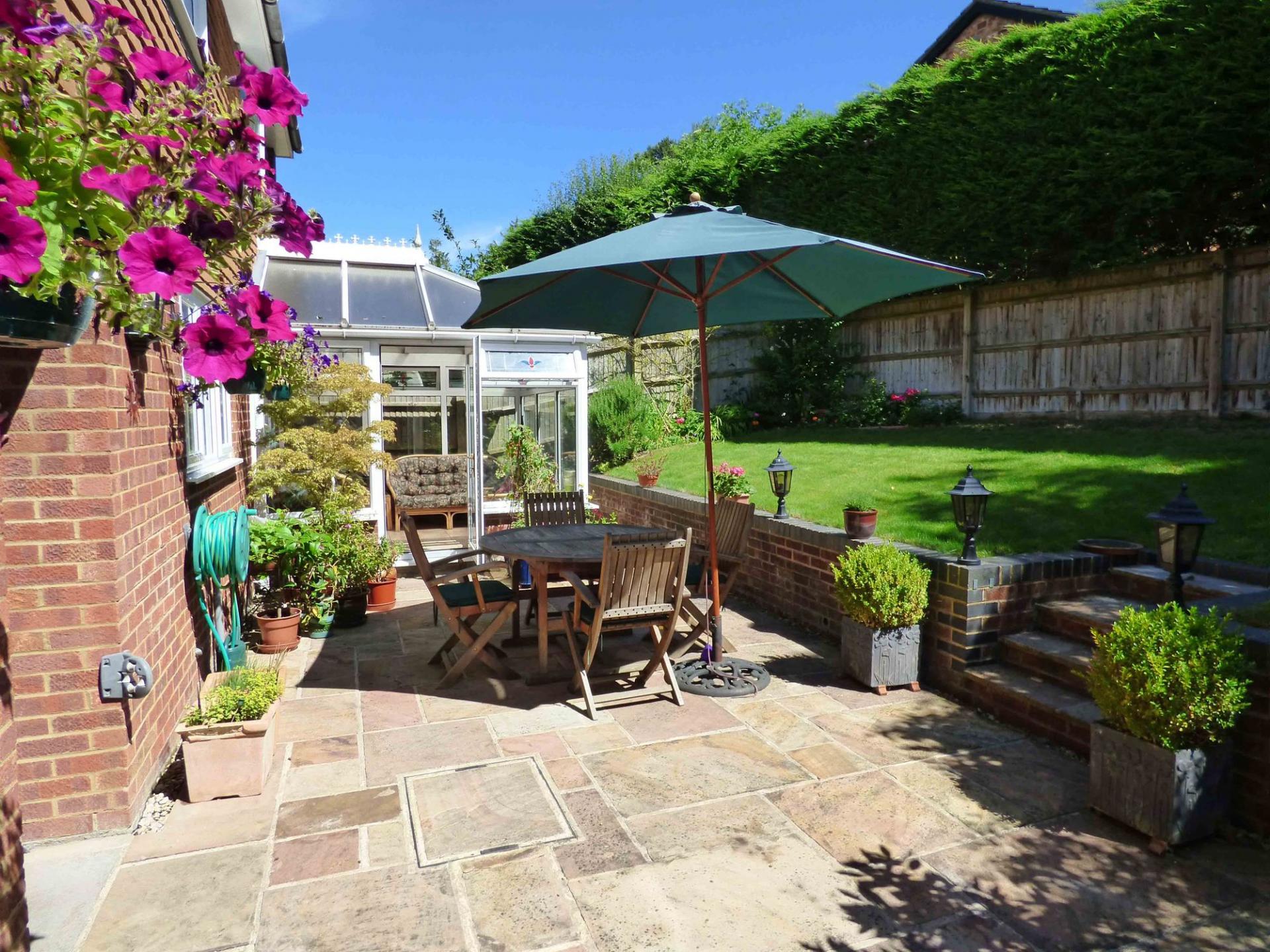 Outside, there is a large patio area with the remaining garden laid mainly to lawn with mature shrubs. A covered walkway provides access to the front of the property where there is driveway parking and a garage.