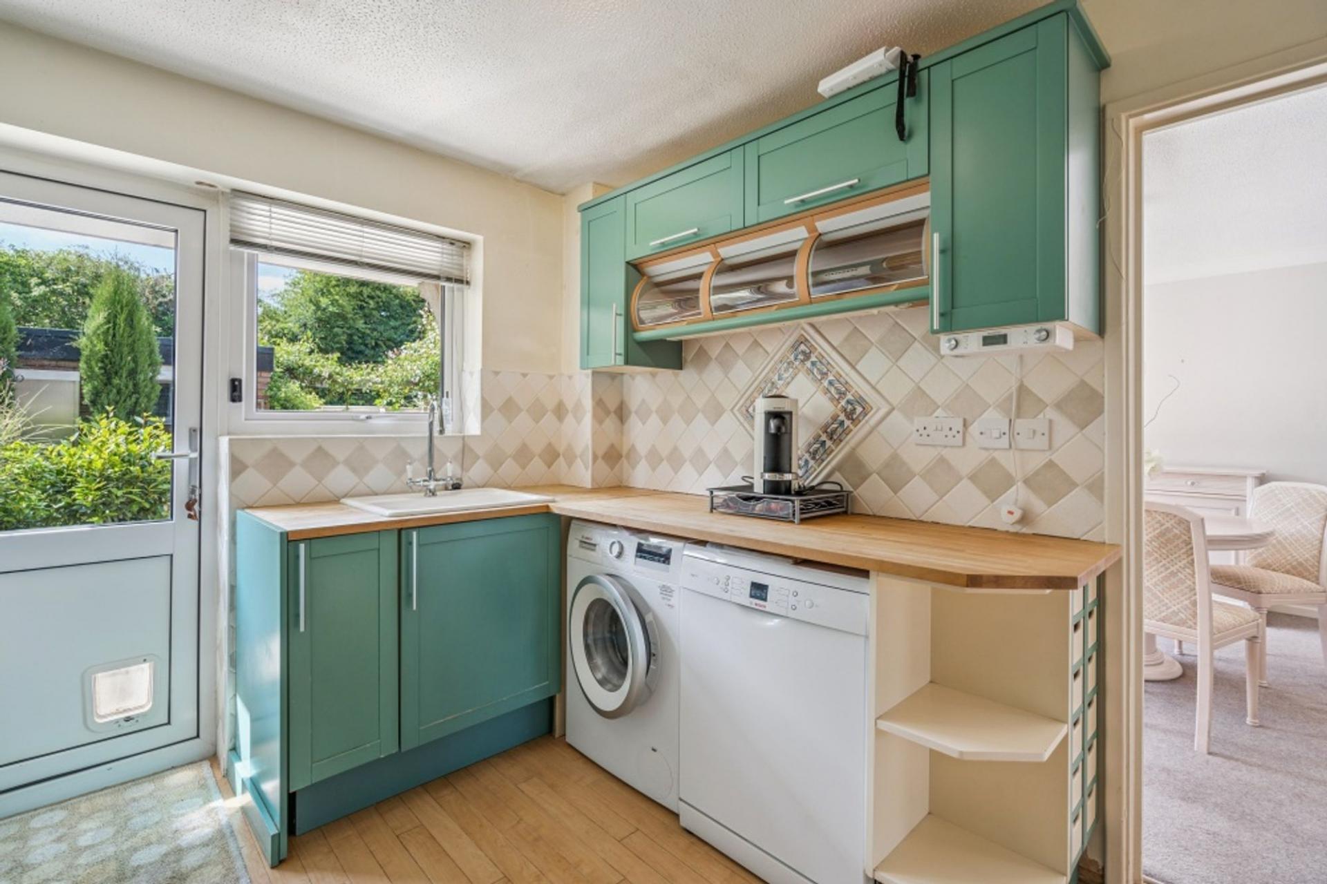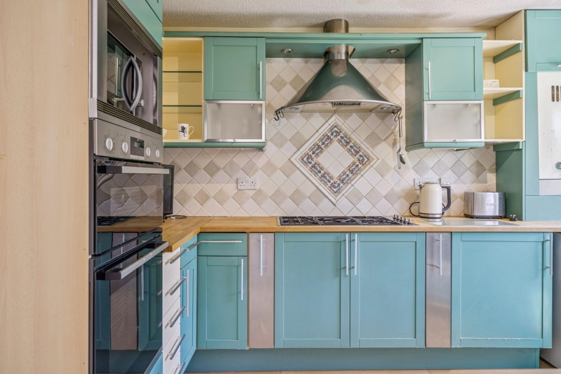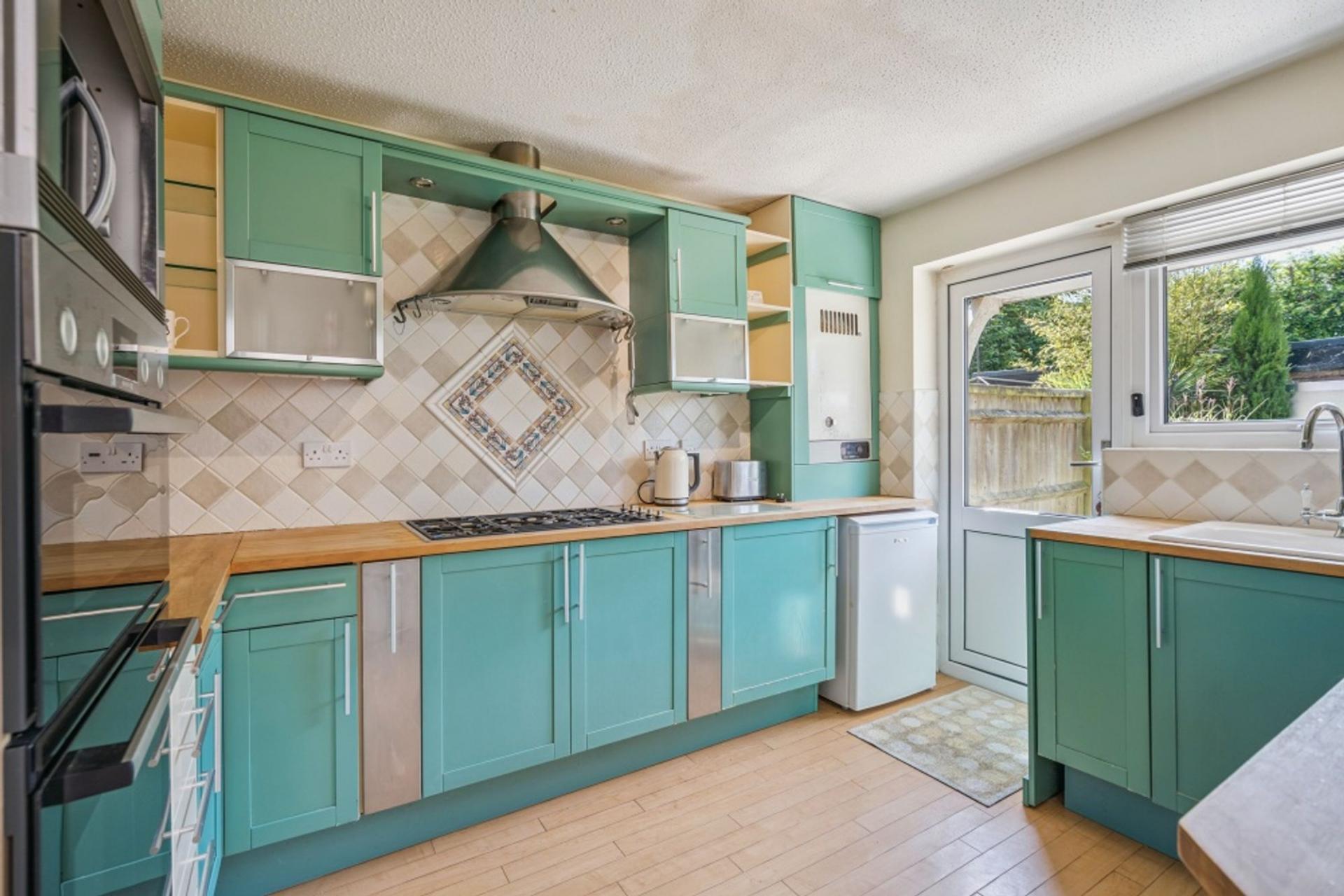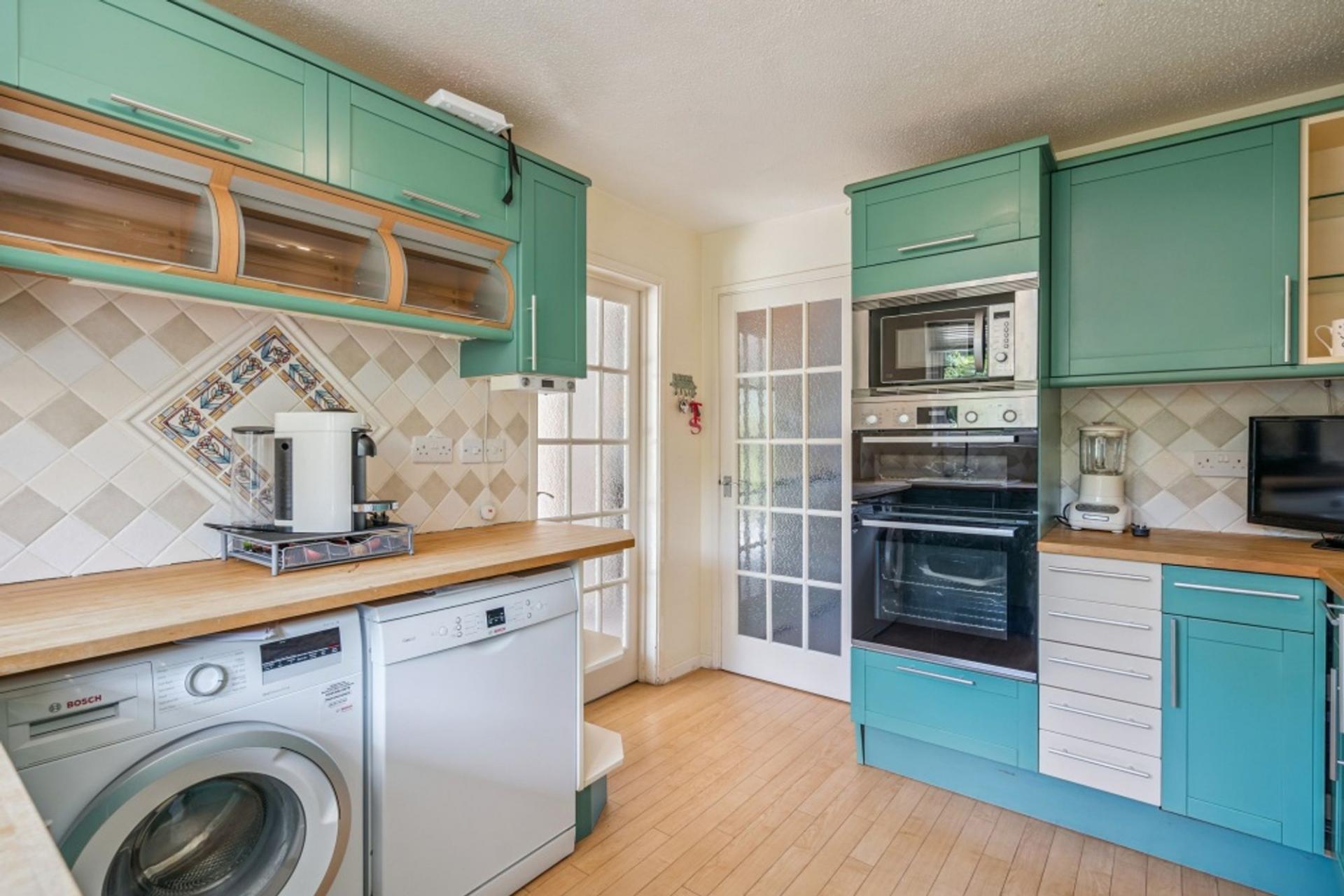 The kitchen is rear aspect and has been fitted with a Mobalpa kitchen with mainly jade-coloured, Shaker-style units and solid timber work tops. There is a five ring Smeg gas hob, Bosch double oven, and space for an under-counter fridge freezer, dishwasher and washing machine plus a door to the back garden.