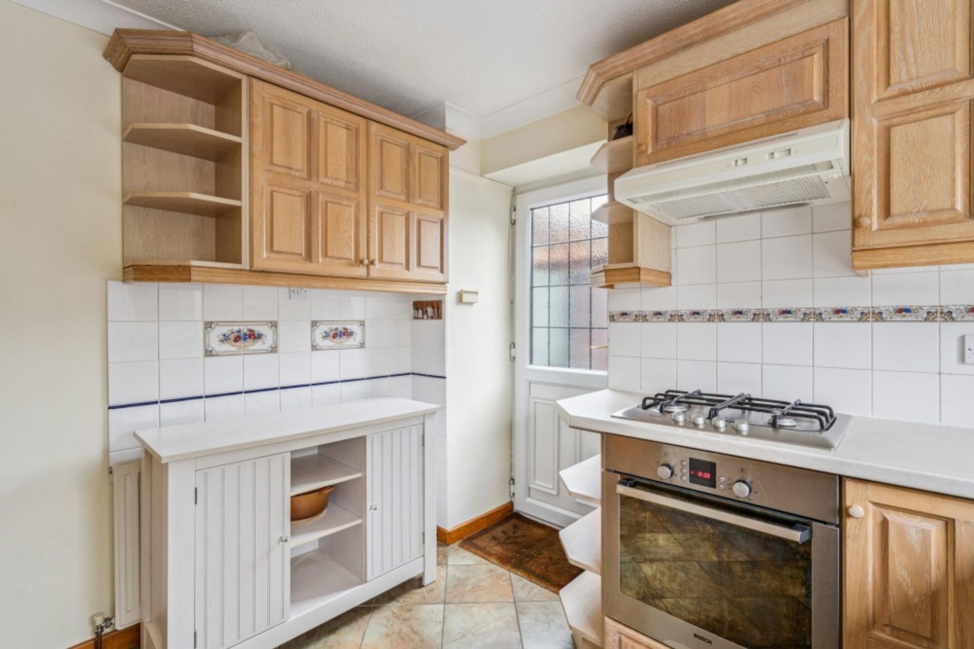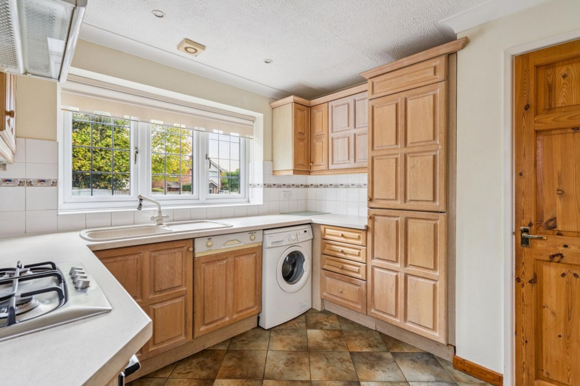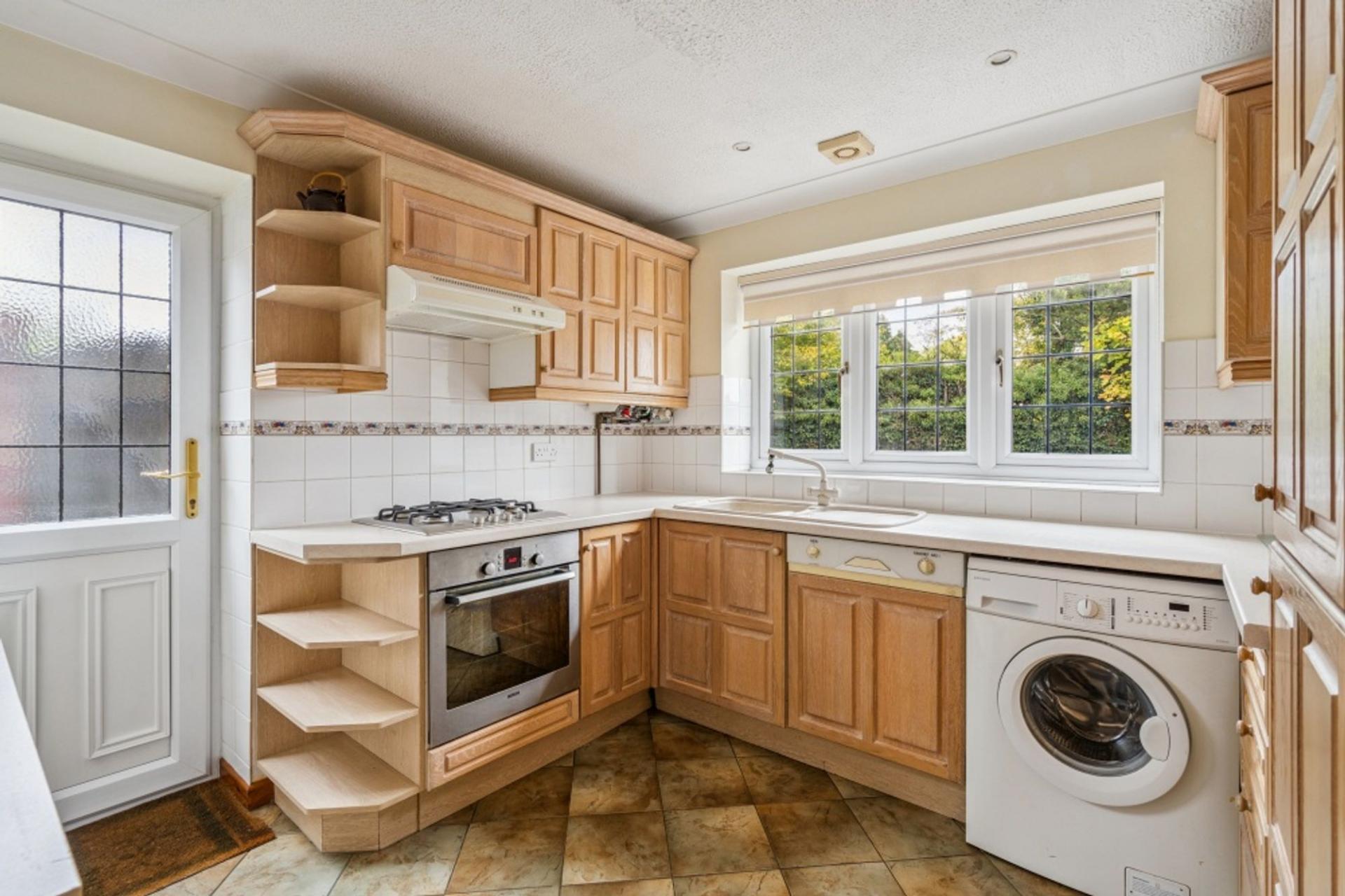 The kitchen has been fitted with a range of limed oak units with tiled splash backs and complementary work surfaces inset with a composite sink, which is under the window overlooking the front. There is an integrated 4 ring gas hob and Bosch electric fan oven and integrated fridge freezer. There is also space and plumbing for a washing machine and a wall mounted gas boiler in the corner. Access to the side passage is via the kitchen door.