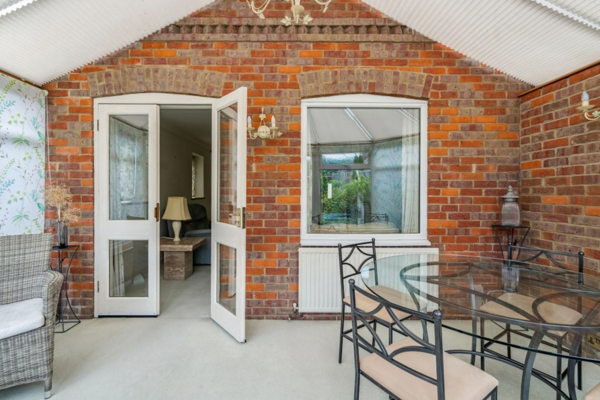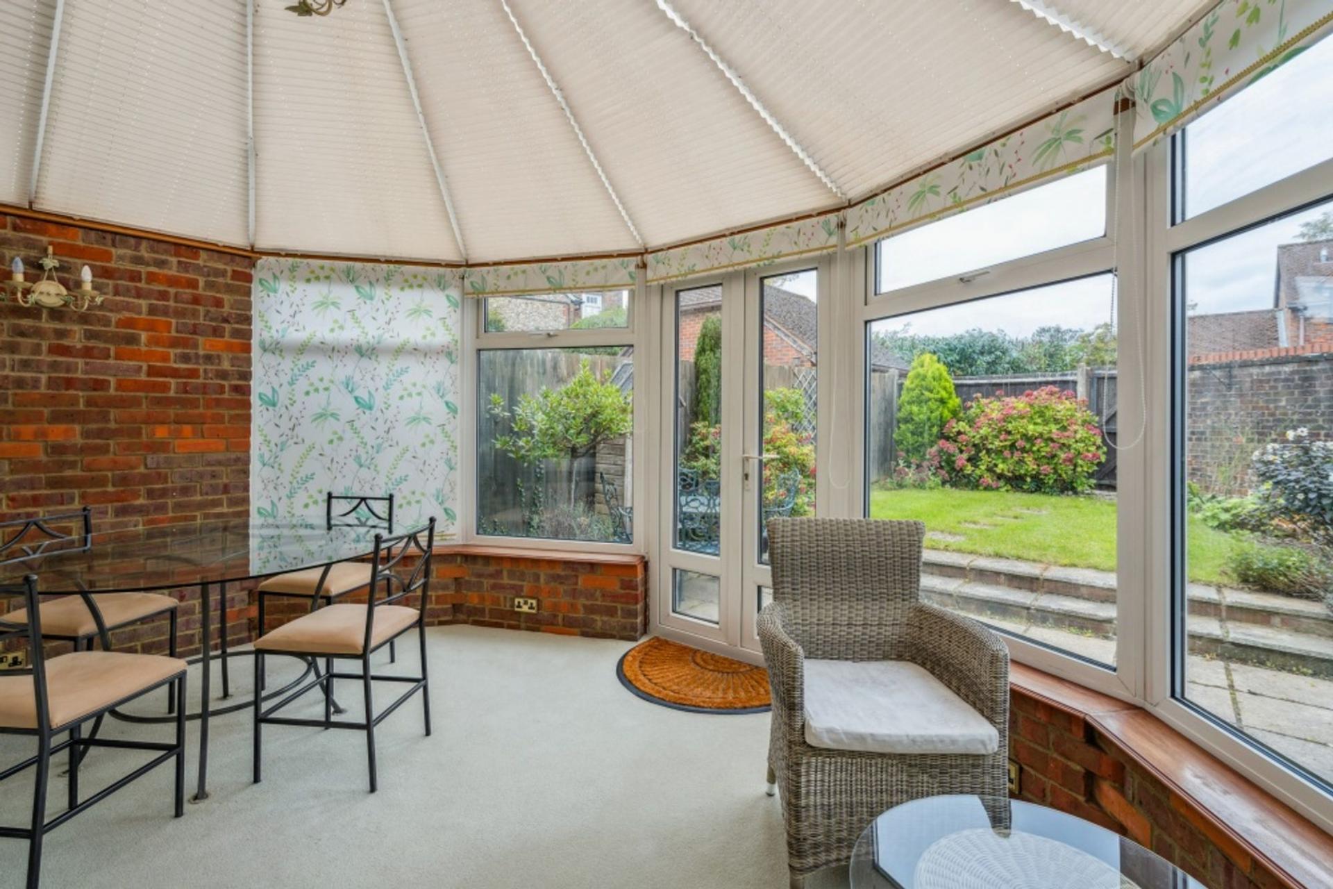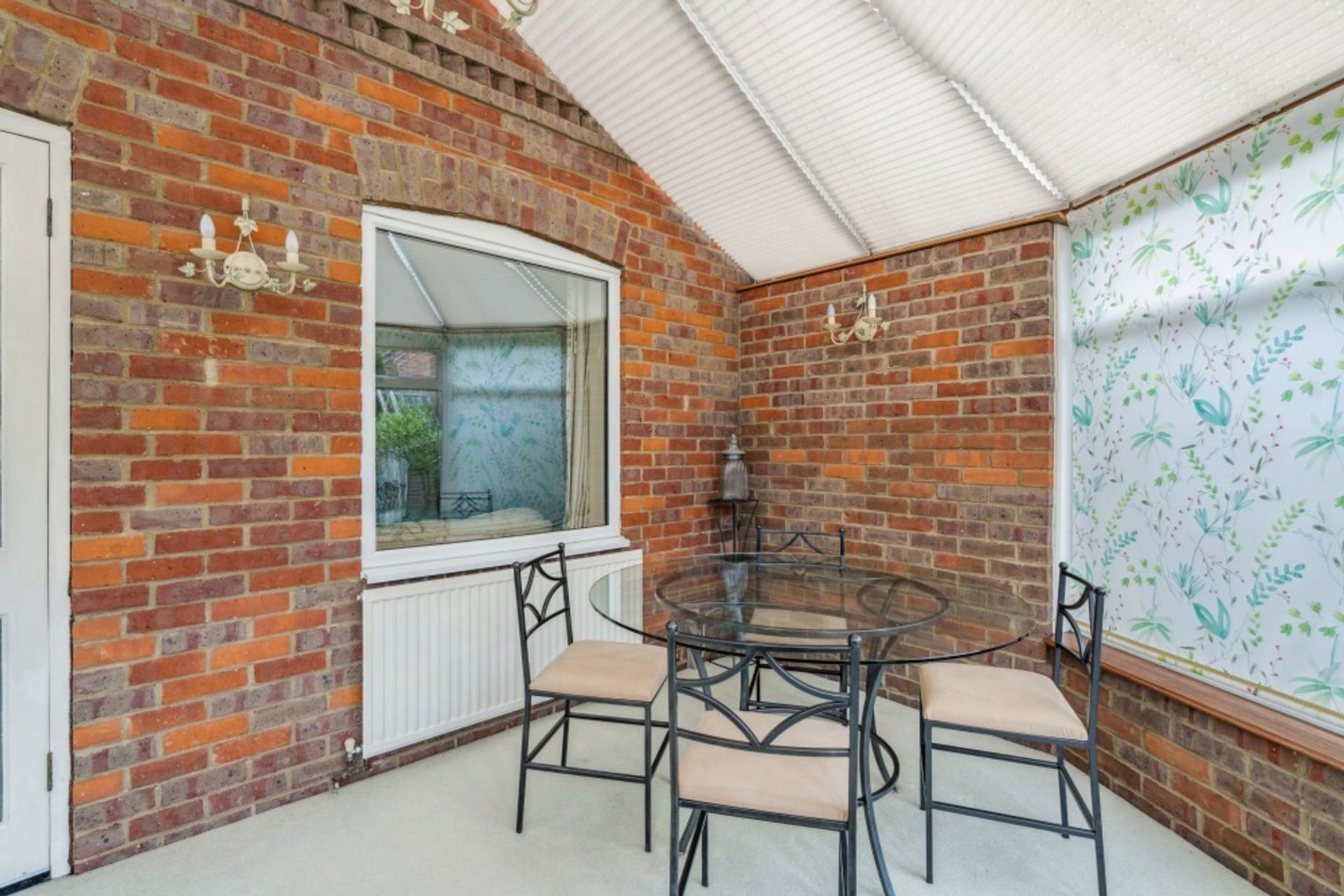 The heptagonal conservatory has part brick walls and French doors out to the garden. The polycarbonate roof is fitted with a set of roof blinds with heating being provided by means of a radiator off the main gas central heating system.