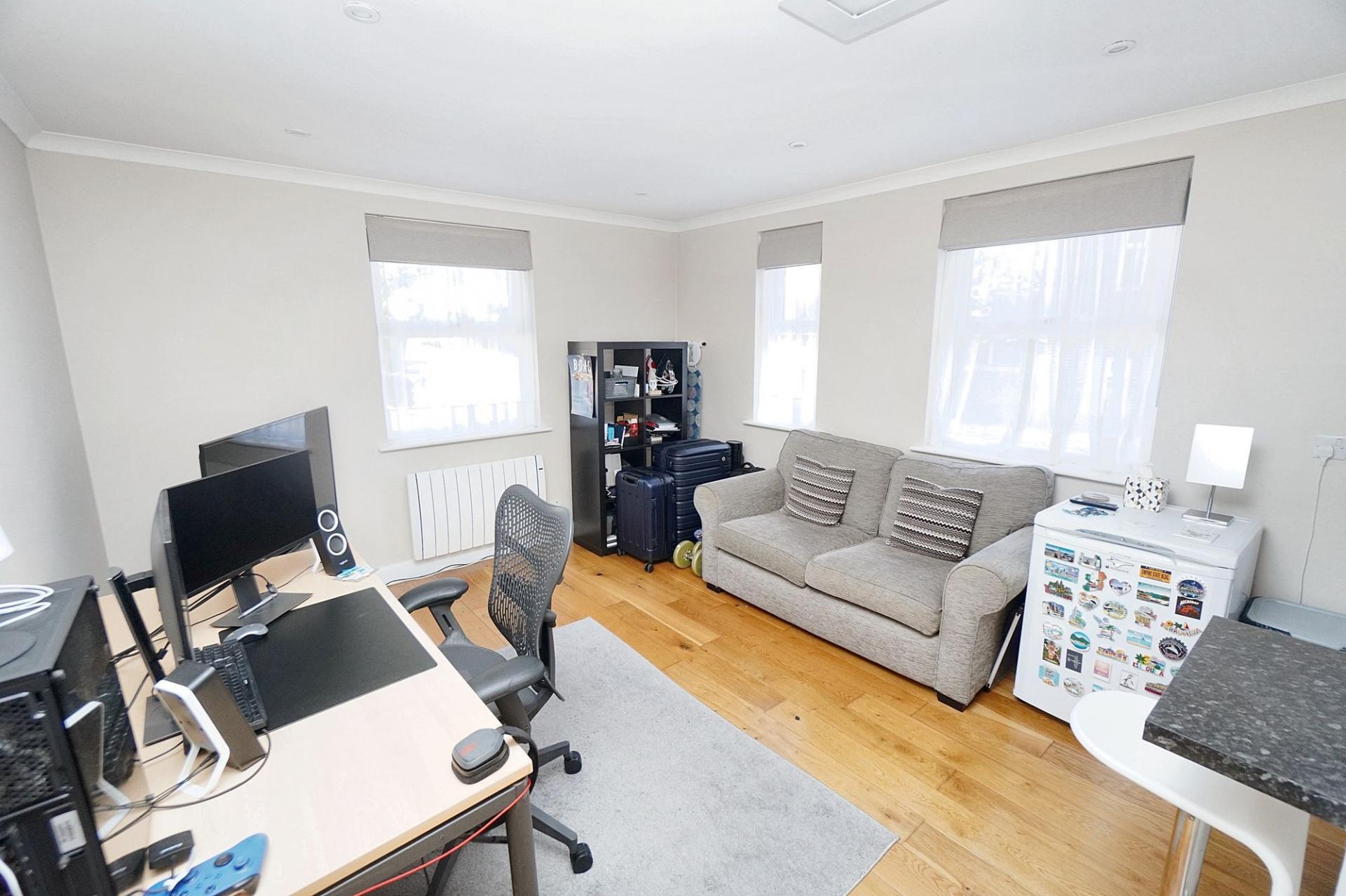 A spacious ground floor one-bedroom apartment with private garden area and garage
