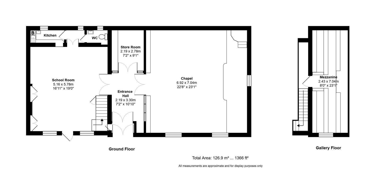 The interior principally comprises the chapel and an attached former schoolroom, both boasting superb double-height ceilings and tall windows bringing in ample natural light. The whole extends to around 1,366 sq.ft. including a balconied gallery within the chapel. There is a central entrance hall with room off, and a kitchen and WC area to the rear. There is plenty of off-street parking to the front which is the total extent of the curtilage.