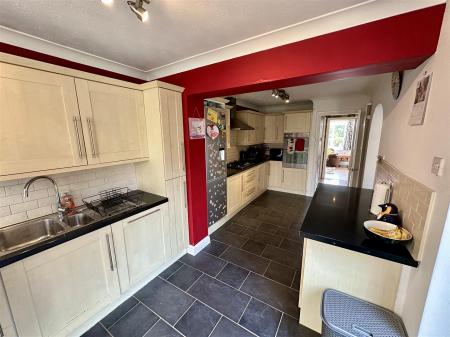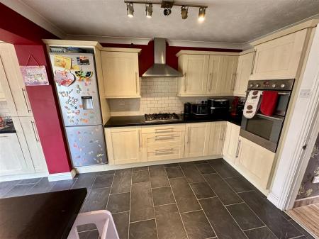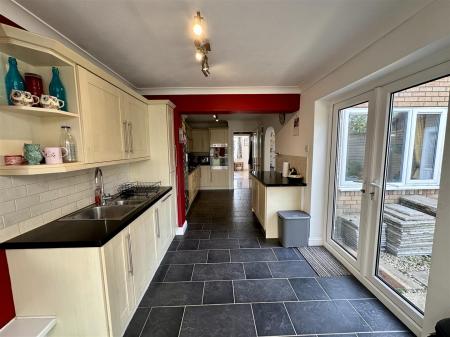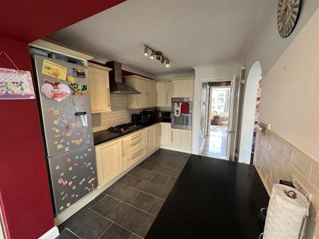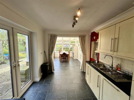 Kitchen - 6.71m x 2.54m (22'0 x 8'4) - One and a half bowl stainless steel single drainer sink unit with mixer tap, range of base and wall mounted units with laminated worktops and tiled splashbacks, integrated double oven with separate five ring gas hob and extractor fan over, integrated fridge / freezer, telephone point, coved ceiling, modern panelled radiator, quarry tiled flooring, side aspect double opening French doors to patio and gardens.