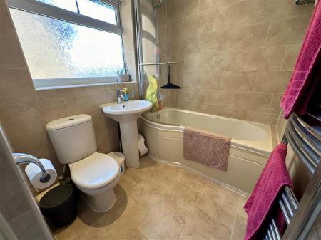 Bathroom - 2.82m x 1.68m (9'3 x 5'6) - Suite comprising of WC, pedestal wash hand basin with mixer tap, large bath unit with mixer tap, Mira Excel shower unit, tiled floor, tiled walls, chrome heated towel rail, spot lighting, extractor fan, door to airing cupboard housing the Vaillant gas fired combi boiler, side aspect frosted window.