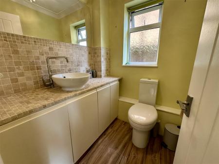 Cloakroom - White suite comprising of WC, vanity wash hand basin with cupboards below, mosaic tiled splashbacks, tiled flooring, chrome heated towel rail, coved ceiling, side aspect frosted window.