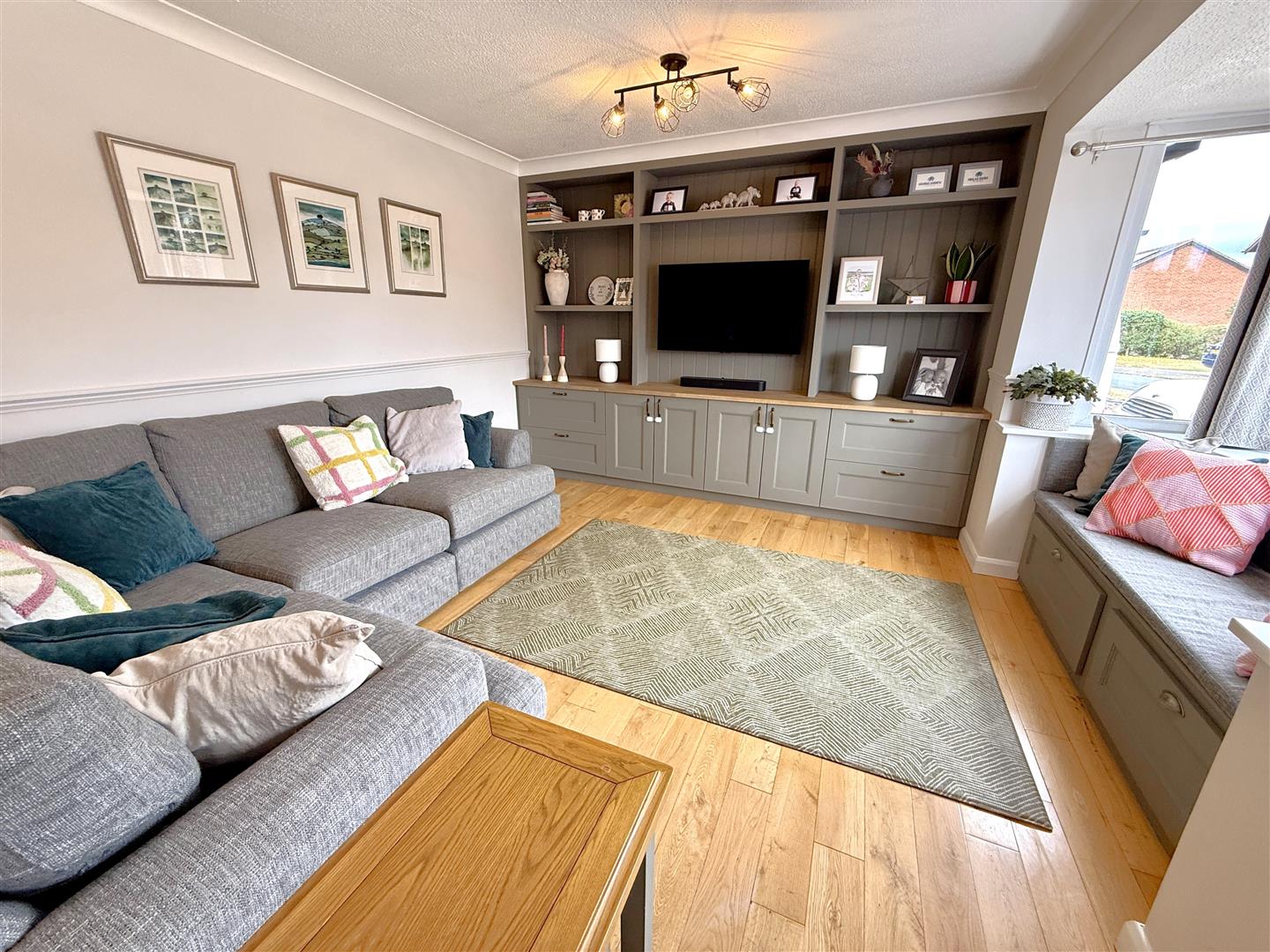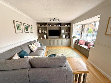 Lounge - 5.92m x 4.14m (19'05 x 13'07) - Feature bespoke media wall with storage, radiator, power point, tv point, dado rail, coving, wooden flooring, front aspect bay window with seat and storage, further front aspect window.