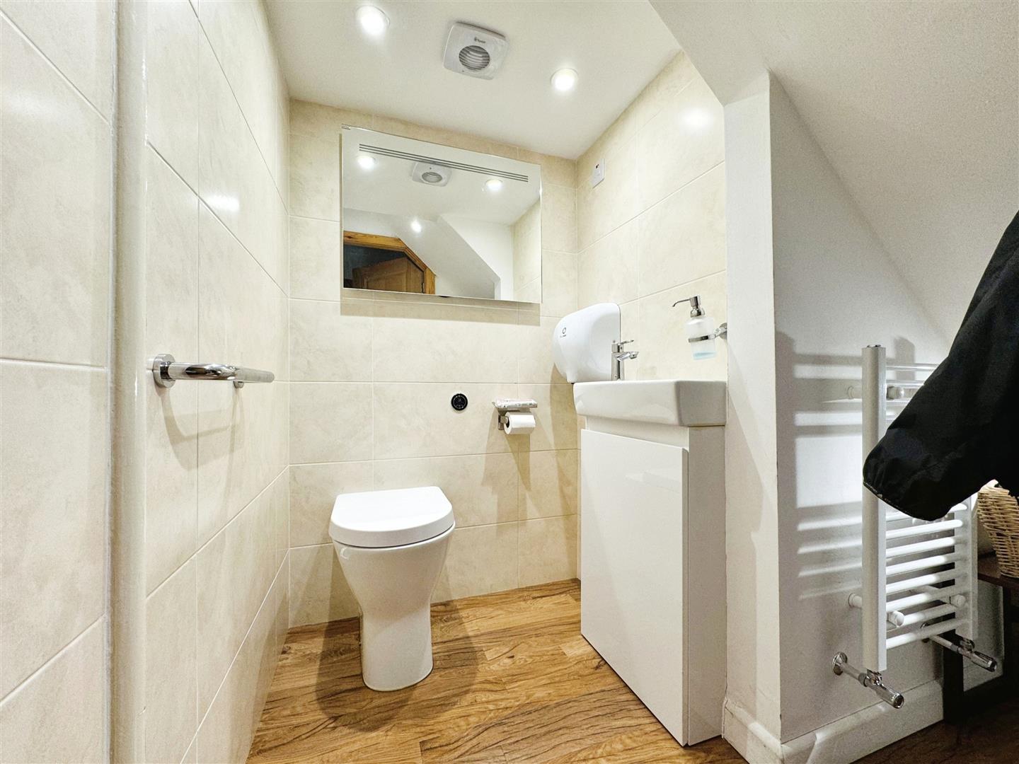 Shower Room - Double glazed window, WC, basin, tiled floor, tiled walls, spotlights & towel radiator.