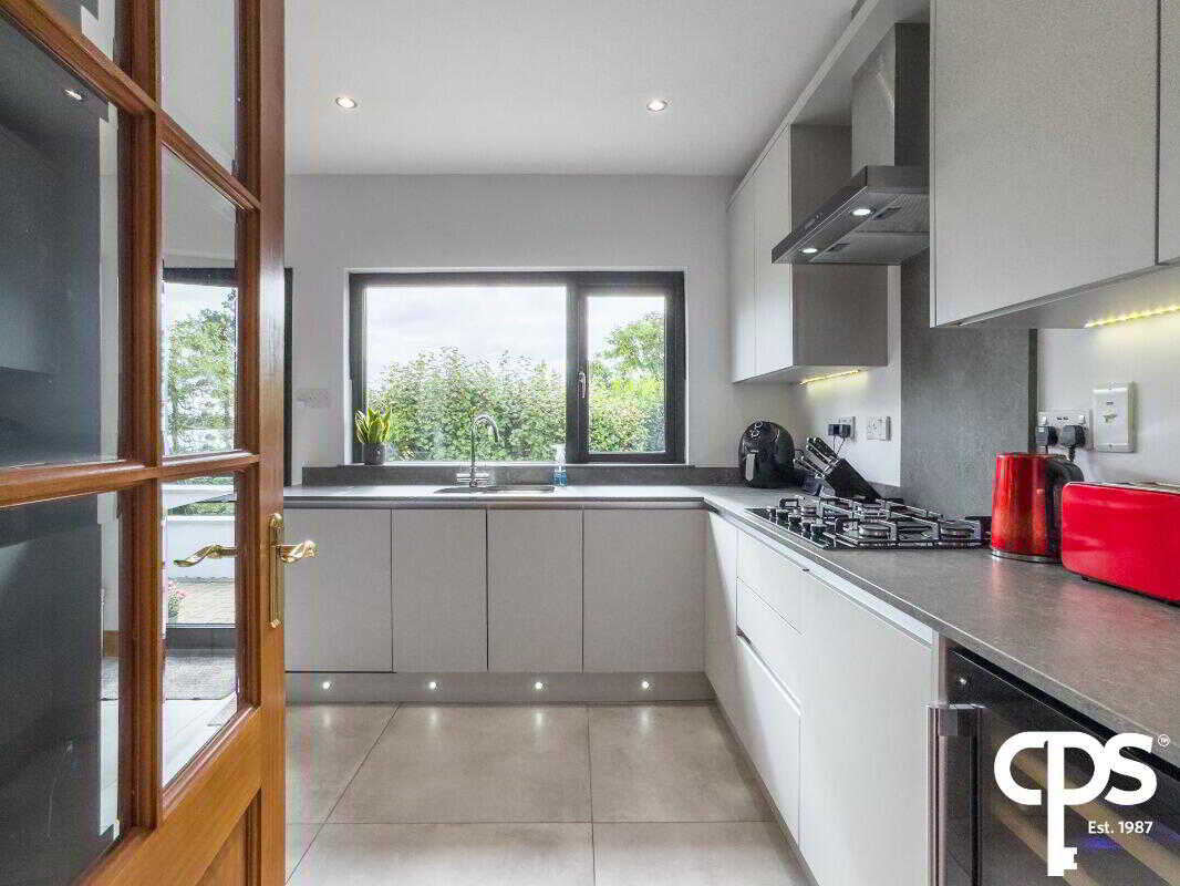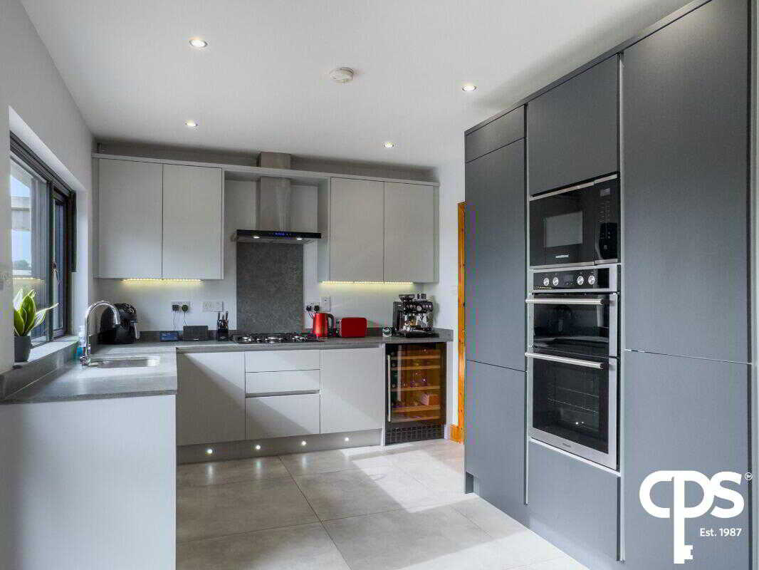 Range of high and low level units, integrated double oven, integrated microwave, integrated 5 ring gas hob, feature kickboard and under unit lighting, stainless steel extractor hood, integrated dishwasher, large integrated wine cooler, integrated fridge freezer.