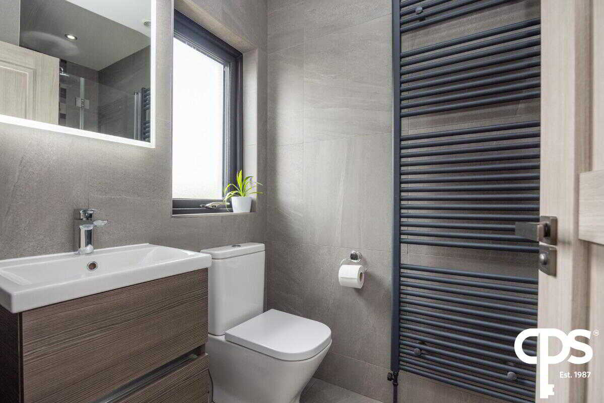 Ceramic floor and wall tiles, enclosed shower with thermal mixer taps, wood effect vanity wash hand basin with chrome mixer tap, low flush WC, light up vanity mirror and tall towel heater.