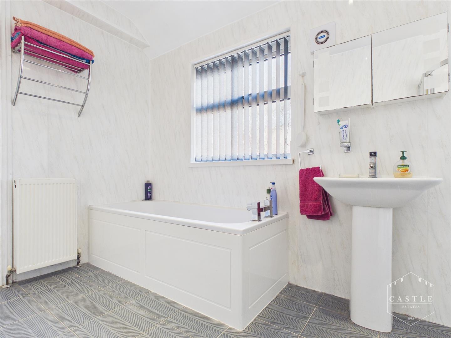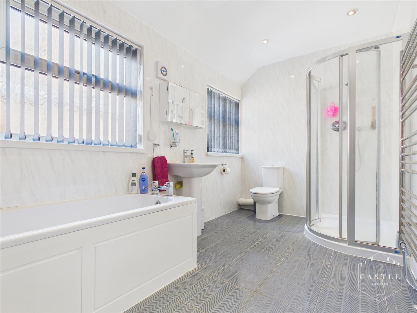 Bathroom - 3.84m x 2.08m (12'7 x 6'10) - having jacuzzi style bath, separate shower cubicle, low level w.c., pedestal wash hand basin, easy clean panelled walls, chrome heated towel rail, central heating radiator, inset LED lighting, extractor fan and two upvc double glazed windows with obscure glass.