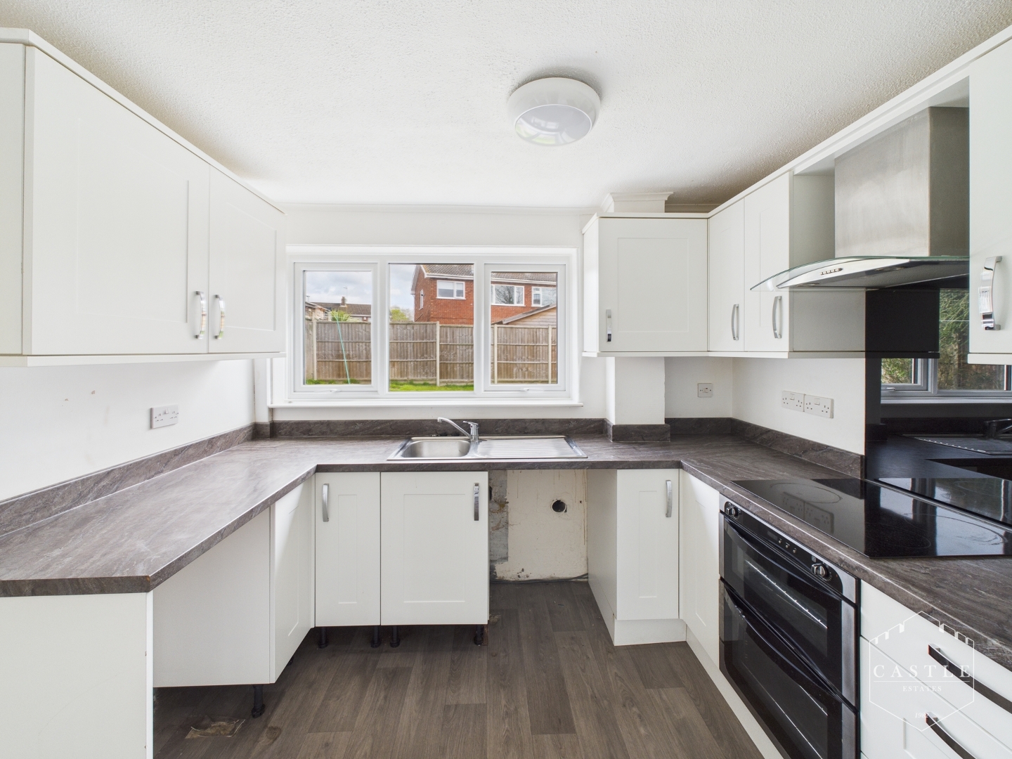 Kitchen - 2.9m x 2.4m (9'6" x 7'10" ) - having range of fitted Shaker units including base units, drawers and wall cupboards, contrasting work surfaces and upstand, inset stainless steel sink with mixer tap, built in electric oven with induction hob over and extractor hood, space and plumbing for dishwasher and washing machine, space for tumble dryer, wood effect flooring, upvc double glazed window to rear.
