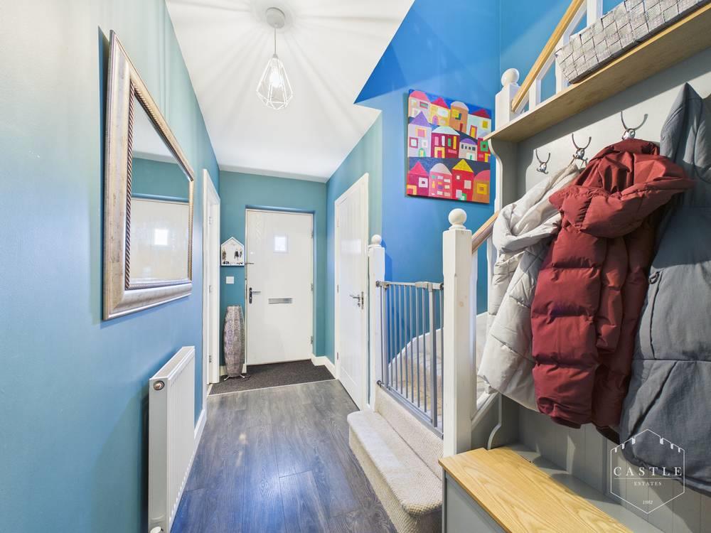 Entrance Hall - 4.41m x 1.31m (14'5" x 4'3") - having composite double glazed front door, grey laminate flooring, built in under stair storage cupboard.