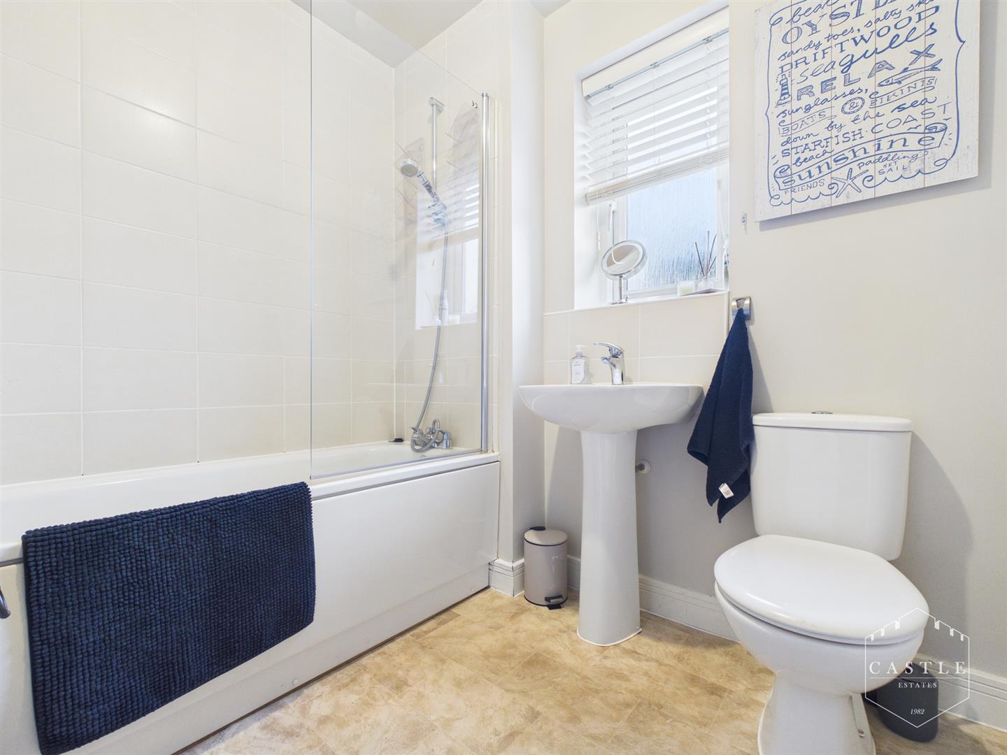 Bathroom - 1.91m,2.18m (6'3,7'2) - To the rear elevation with frosted window and fitted blind, fitted bath with shower over and full tile surround, pedestal sink with tile splashback, extractor fan, fitted w/c, central heating radiator, vinyl flooring
