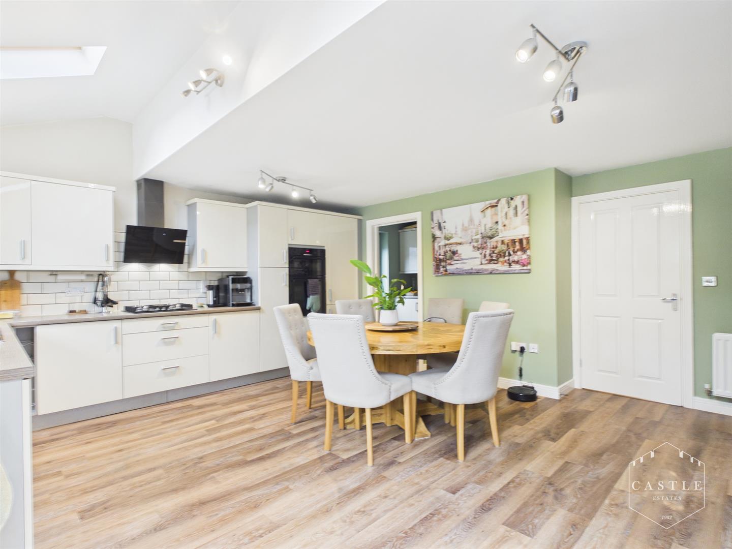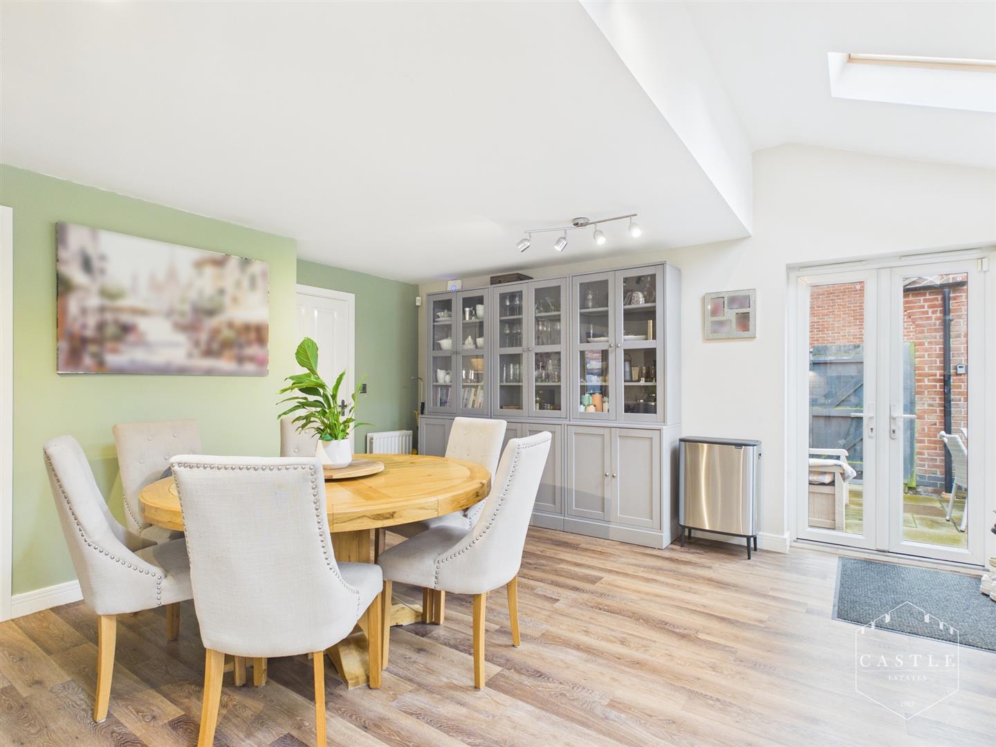 Kitchen Diner - 4.50m,5.18m (14'9,17'0) - To the rear elevation with French doors to side elevation, rear windows with fitted blinds along with two skylights, Karndean flooring, contemporary range of fitted base and wall units with worktop and tile splashback. Newly fitted four burner fitted Bosch gas hob and extractor fan, sink with mixer tap, integrated dishwasher, fridge freezer and newly fitted Bosch double fan oven, two double panel central heating radiators.