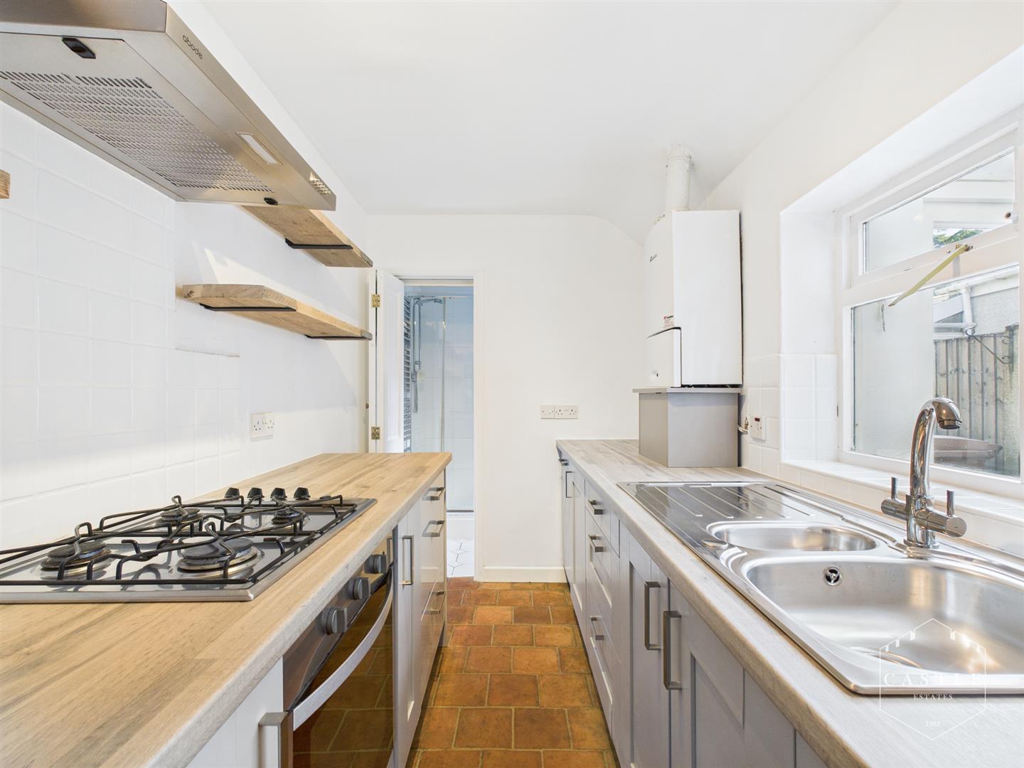Kitchen - 3.08m x 1.83m (10'1" x 6'0" ) - having an attractive range of Shaker style fitted units including base units, drawers and wall cupboards, contrasting work surfaces and ceramic tiled splashbacks, inset stainless steel sink with mixer tap, built in oven and gas hob with cooker hood over, integrated dishwasher, built in gas fired boiler for central heating and domestic hot water and double glazed window.