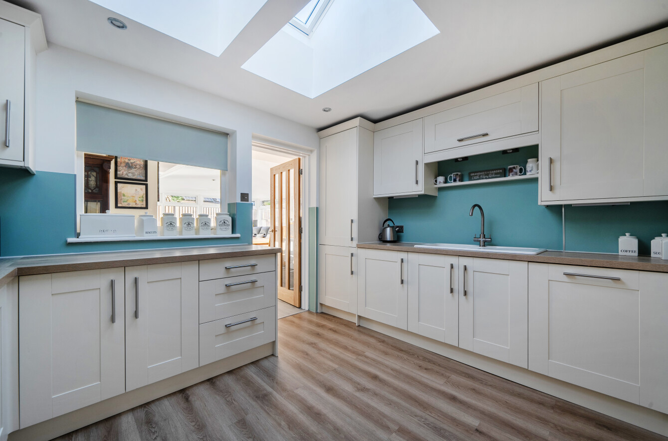 Also to the front of the house is a spacious double aspect sitting room with large picture window and patio doors out to a side garden; being west facing this room enjoys lovely westerly sunsets. A central feature is a recently installed wood burning stove.