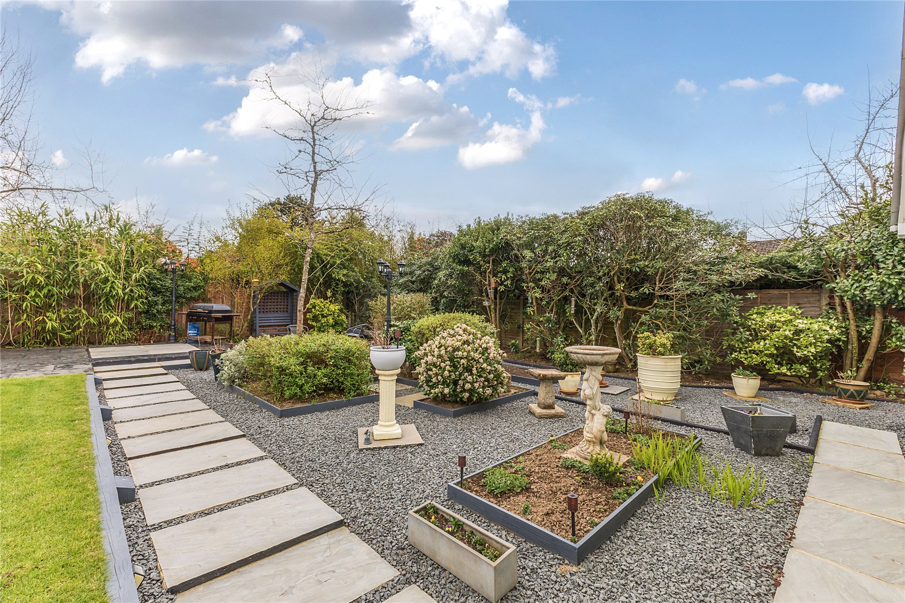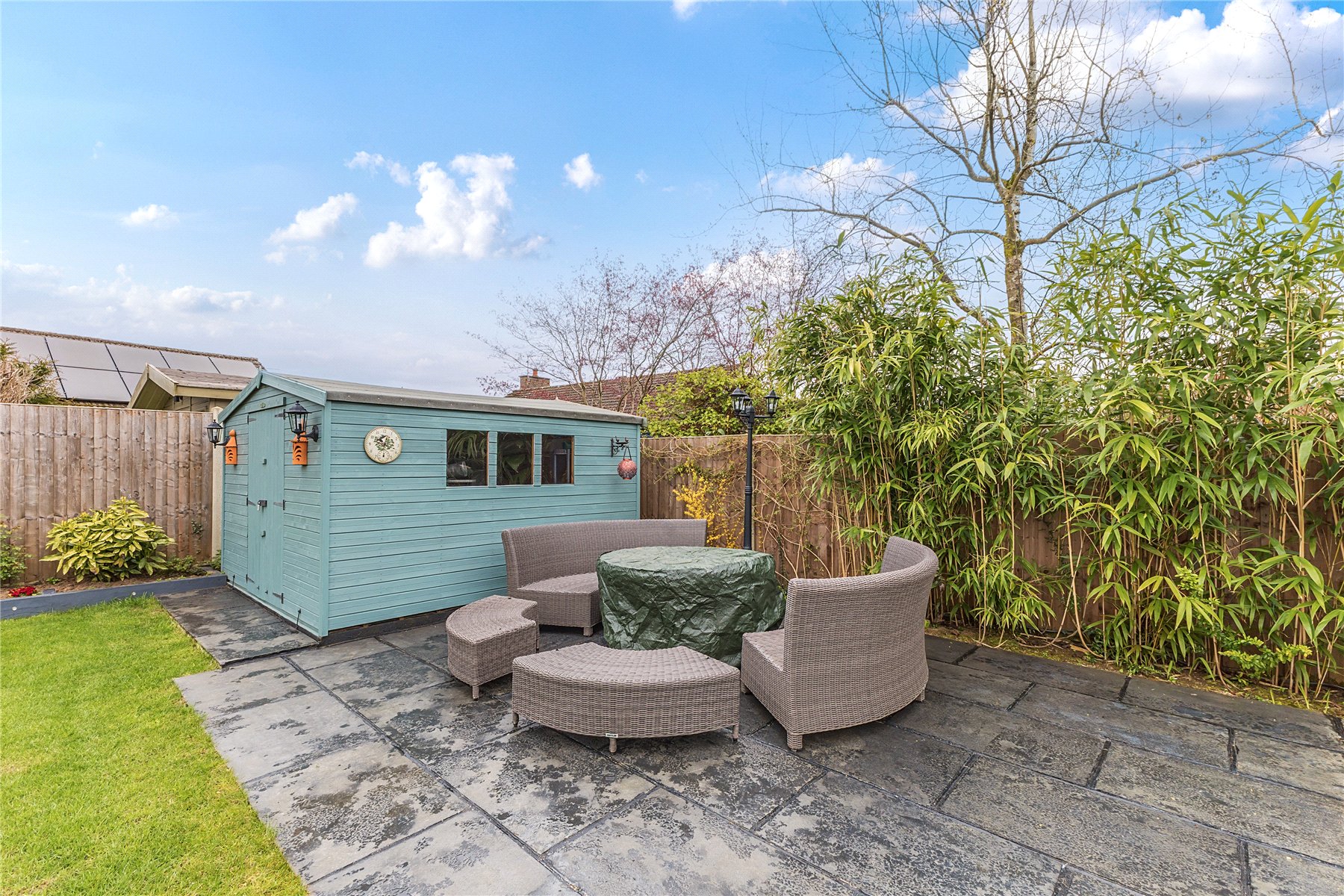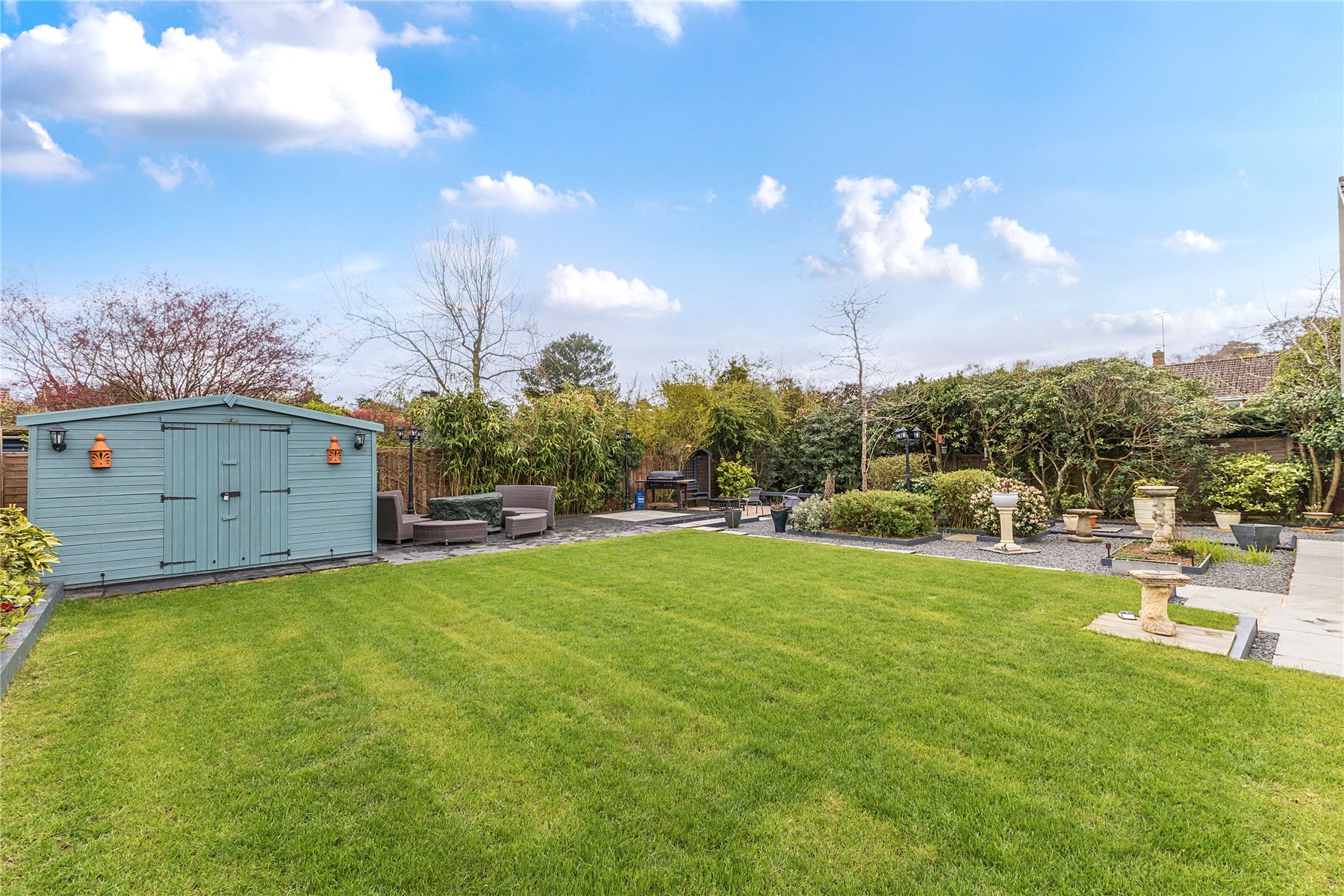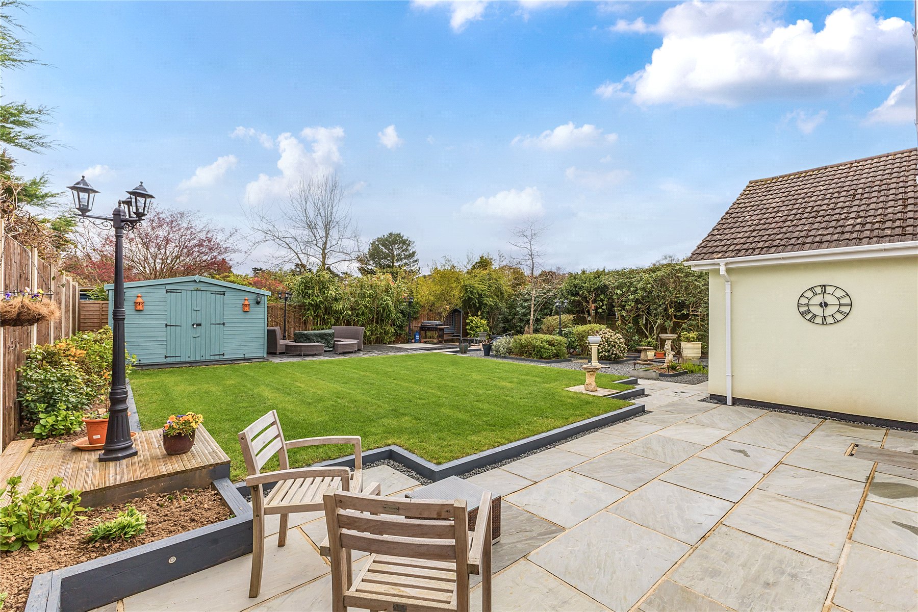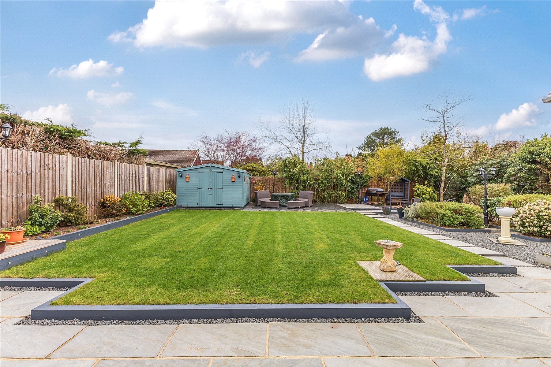 Lovingly landscaped rear garden, offering low maintenance and maximum enjoyment with a generous lawn, raised flower beds and two Indian Sandstone patio areas; bathed in sunshine throughout the day. In one corner is a good sized shed, ideal for tools and storing garden furniture over the winter. The garden extends around to both sides, offering a slightly large space to the westerly aspect with space for a further shed, flower beds or patio areas.