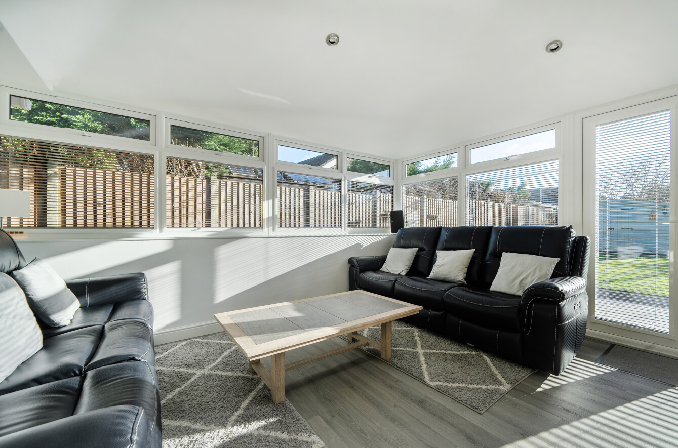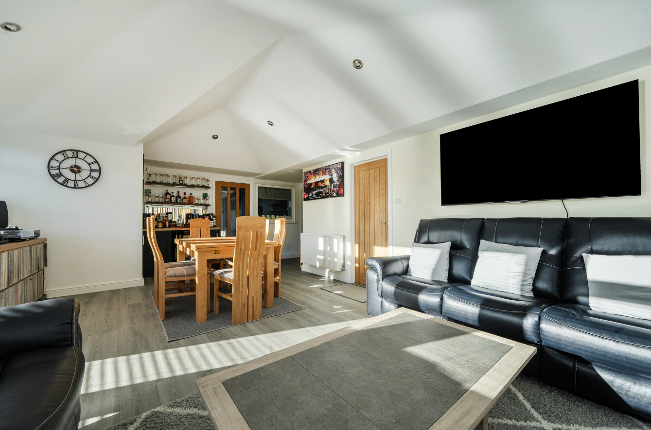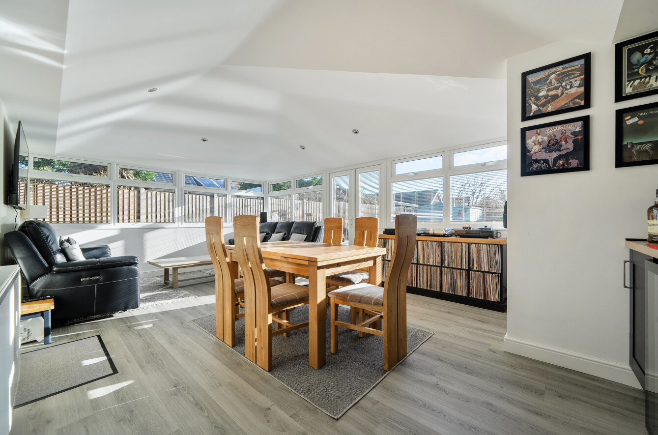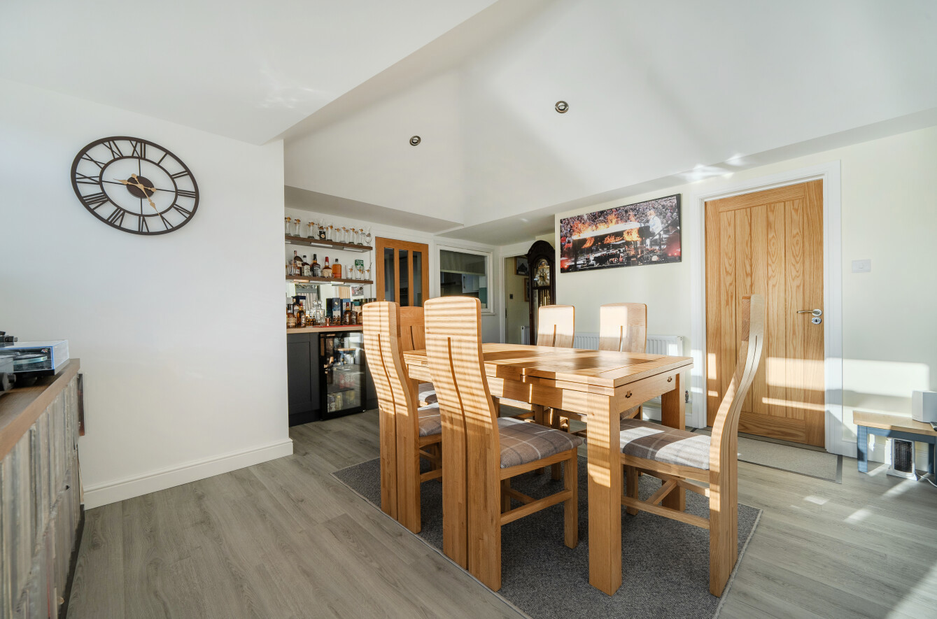 To the far side of the kitchen is a spacious additional reception room; currently used as a dining/family room. The room benefits from views over the rear garden with patio doors opening directly onto it. South east facing this room enjoys plenty of sunlight. There is also internal access to the garage from this room.