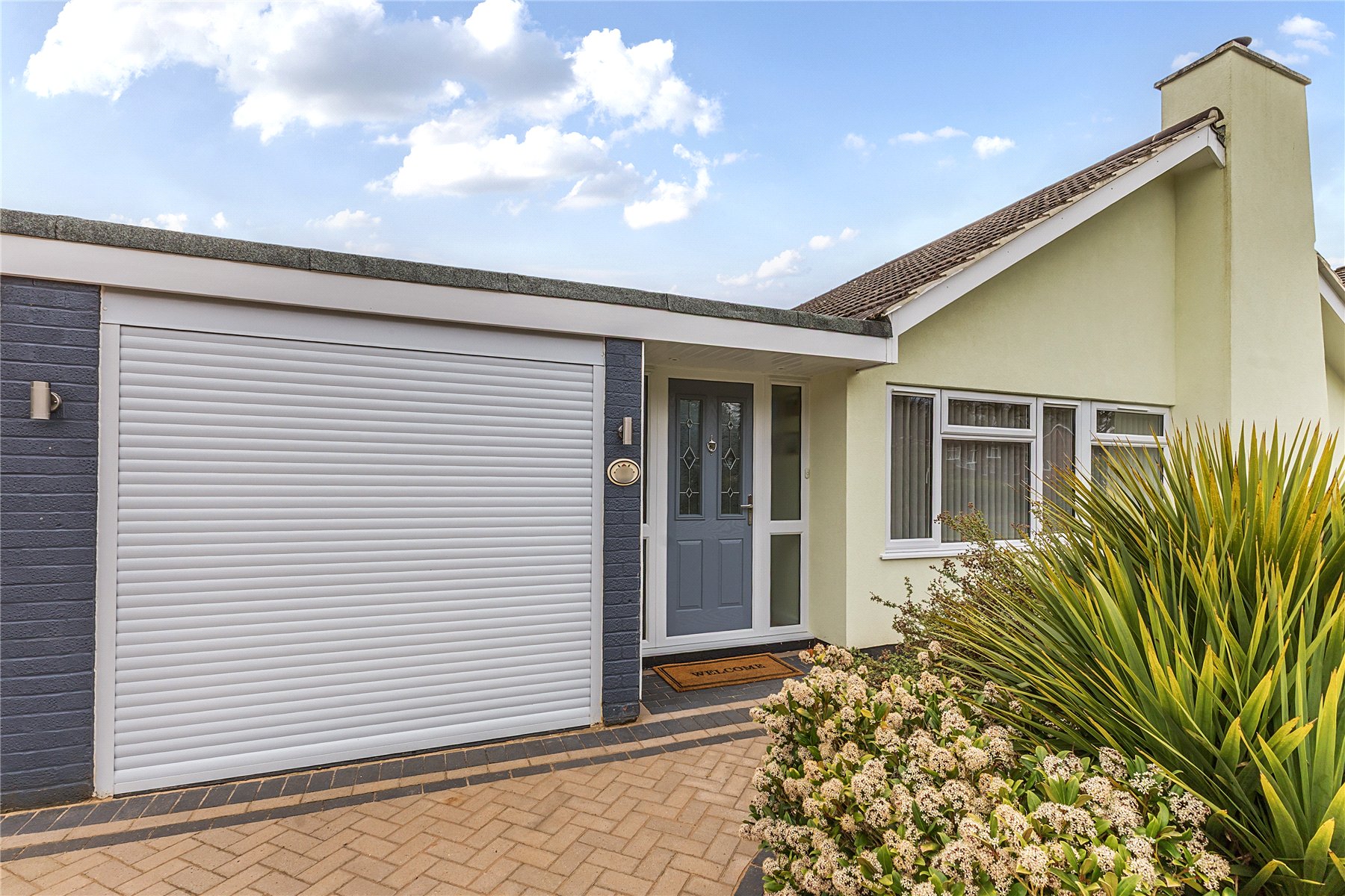 To the front of the property sits a level lawned garden with attractive herringbone block paved driveway to the side, offering parking for 4 vehicles, leading up to an integral double garage with twin electric roller doors (there is space and plumbing for a washing machine and tumble dryer within).