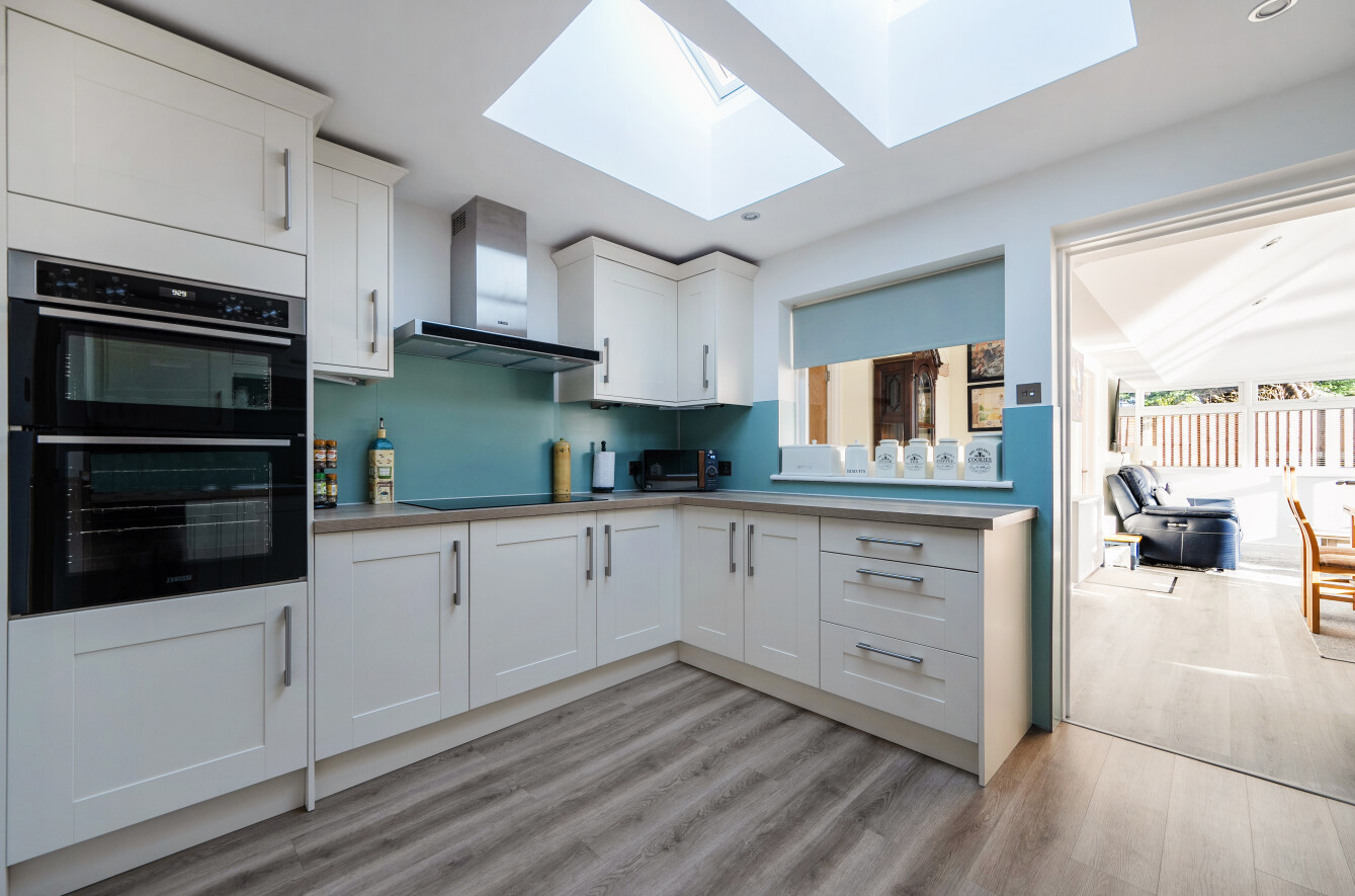 The kitchen is modern and recently refitted, with a range of drawer and cupboard storage, coated aluminium splashbacks and Zanussi integrated appliances (fridge freezer, dishwasher, induction hob and double oven).