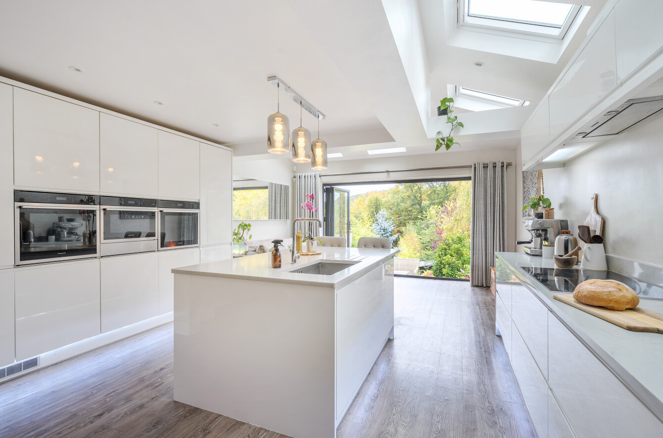 Extending across the rear of the house is a super 22'5 x 20'8 open plan kitchen/diner/lounge with roof lanterns and two sets of patio doors allowing sun to flood in (being south facing) and garden views to be enjoyed. The kitchen is fitted in a modern white suite of drawer and cupboard units including a central island and integrated appliances.