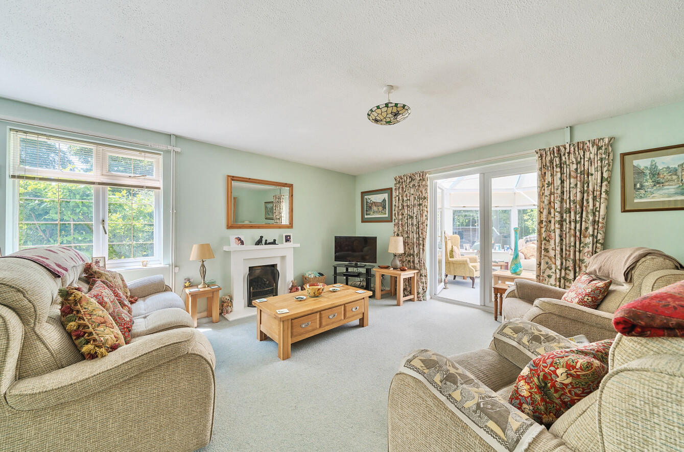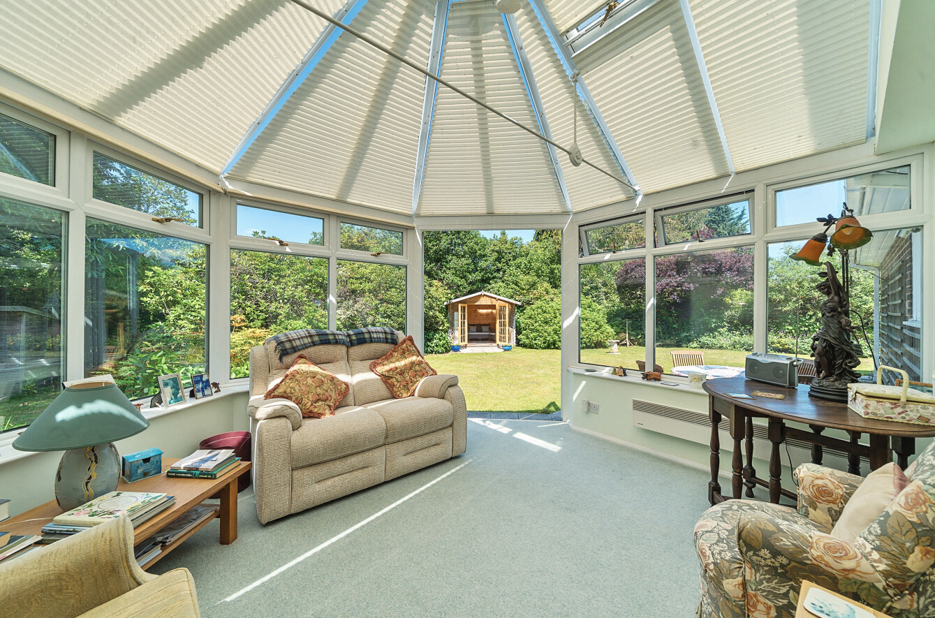 A private side door opens into an entrance hall with WC. Beyond this is a wonderfully bright and very spacious dual aspect living room with gas fire place and patio doors leading into a conservatory with electric heating and radiator, overlooking the patio and stunning surrounding gardens.